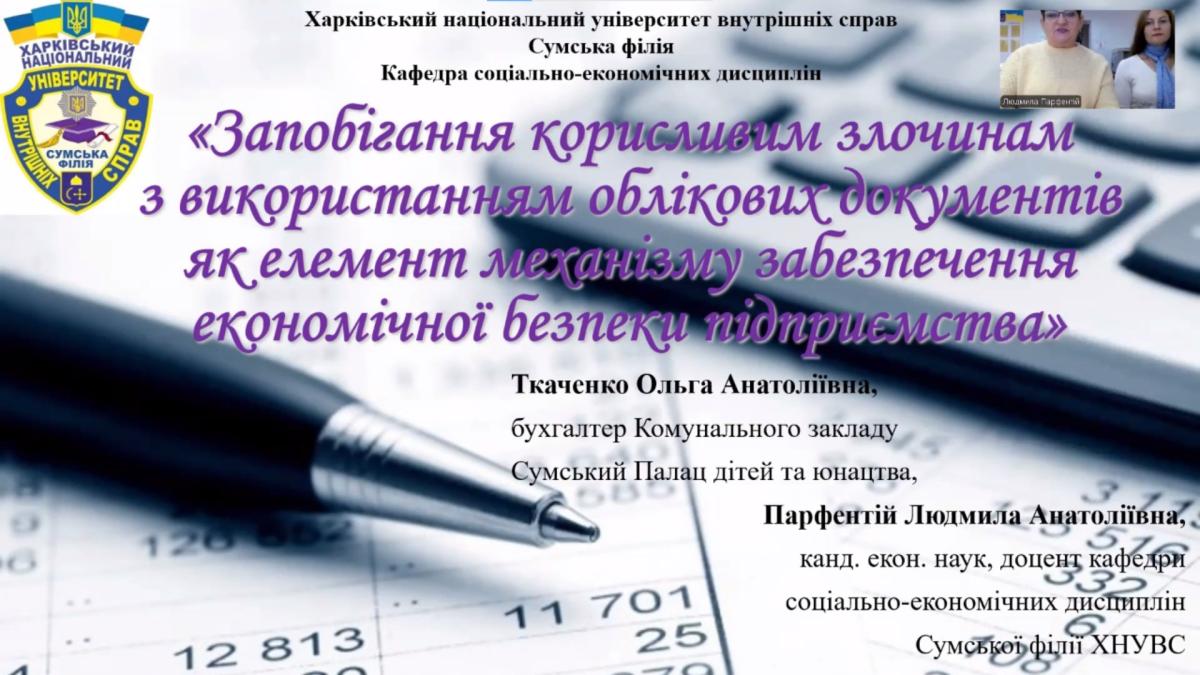 Кандидатом економічних наук, доцентом кафедри соціально-економічних дисциплін Сумської філії Харківського національного університету внутрішніх справ Парфентій Людмилою Анатоліївною спільно з бухгалтером Комунального закладу Сумський Палац дітей та юнацтва Ткаченко Ольгою Анатоліївною в режимі відеоконференції було проведене заняття з дисципліни «Основи економічної безпеки» на тему "Запобігання корисливим злочинам з використанням облікових документів як елемент механізму забезпечення економічної безпеки підприємства" для студентів 3 курсу денної форми навчання спеціальності 262 Правоохоронна діяльність.