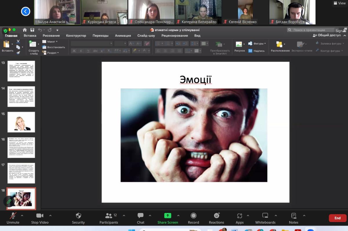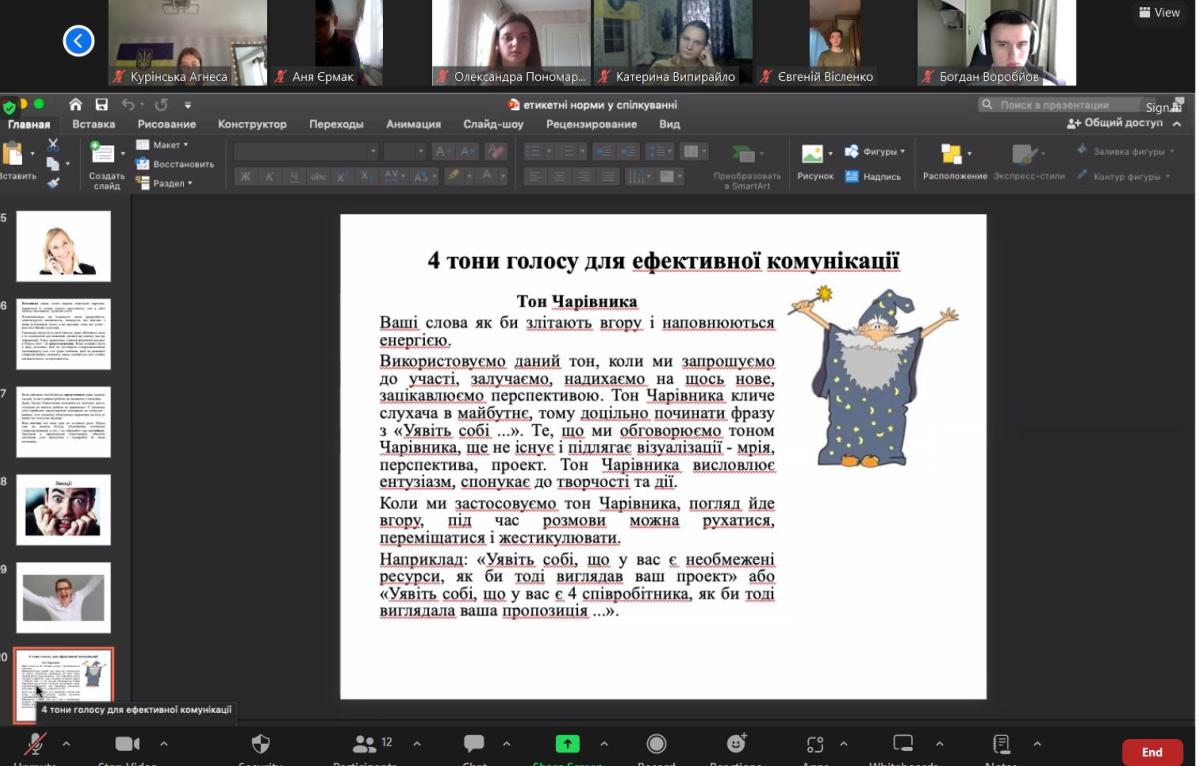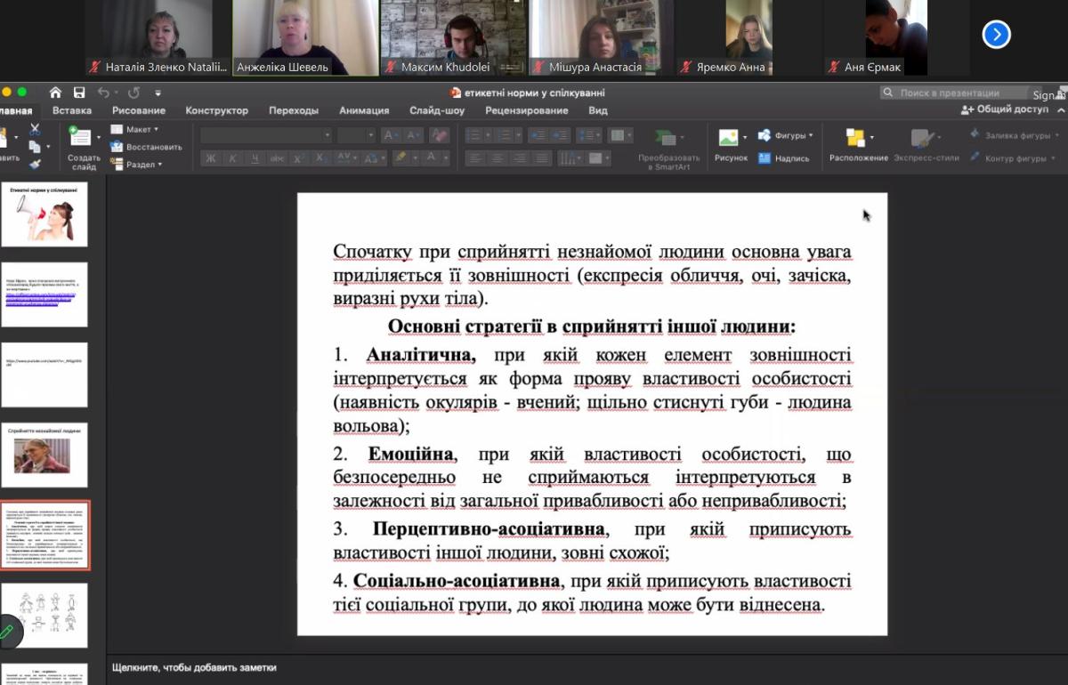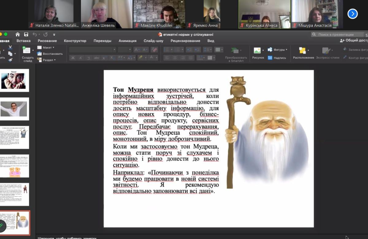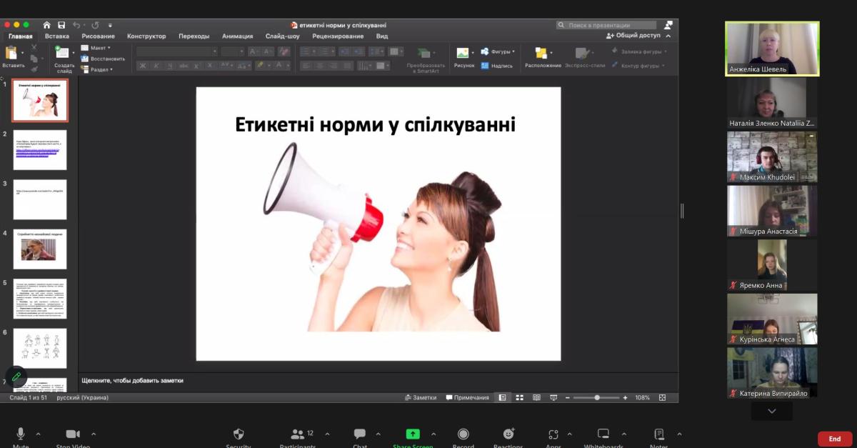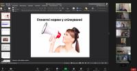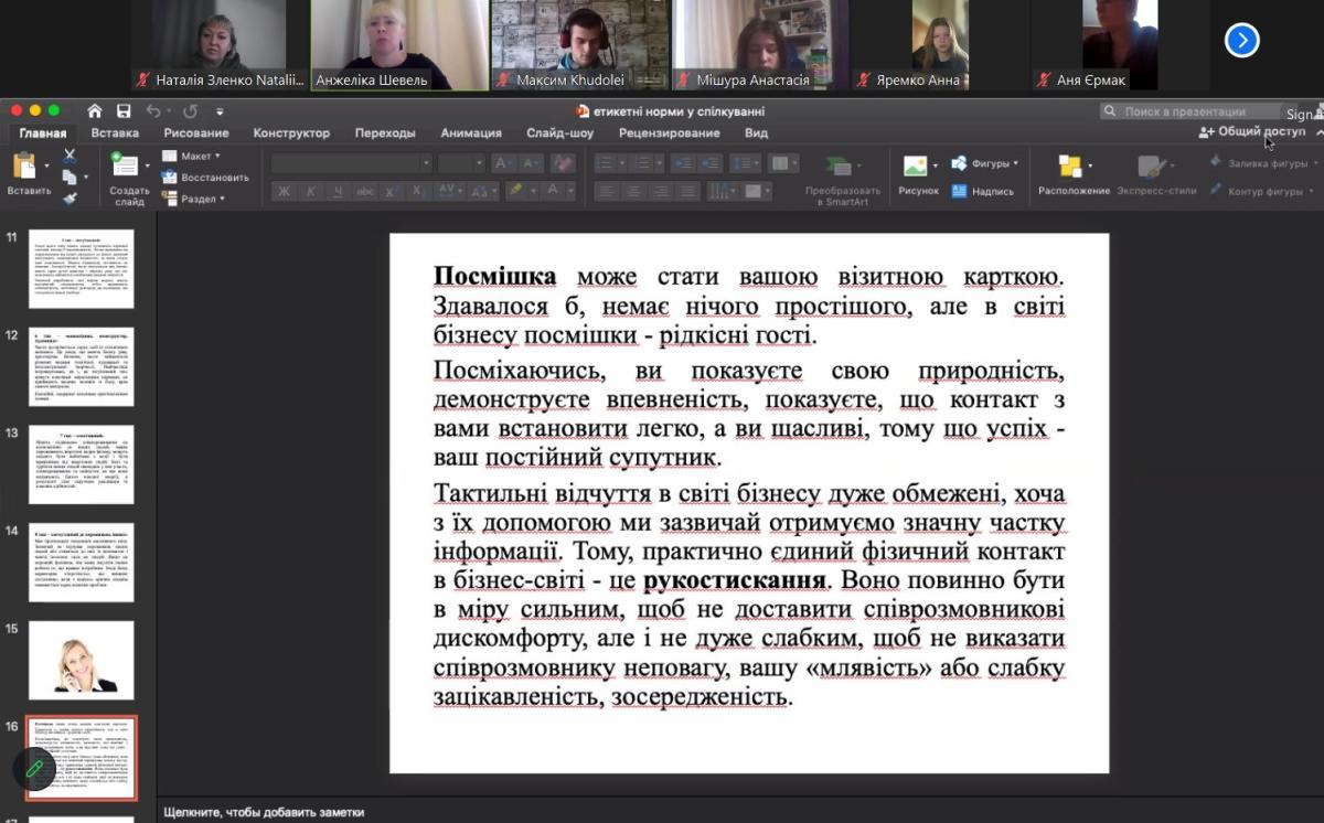 Для здобувачів групи СФдср-24-1Пр у межах дисципліни «Професійна етика» було проведено бінарне онлайн-заняття на тему «Етика ділового спілкування та службовий етикет юриста» доцентом кафедри правосуддя та філософії Сумського національного аграрного університету Шевель А.О. та доцентом кафедри гуманітарних дисциплін Сумської філії ХНУВС Зленко Н.М.