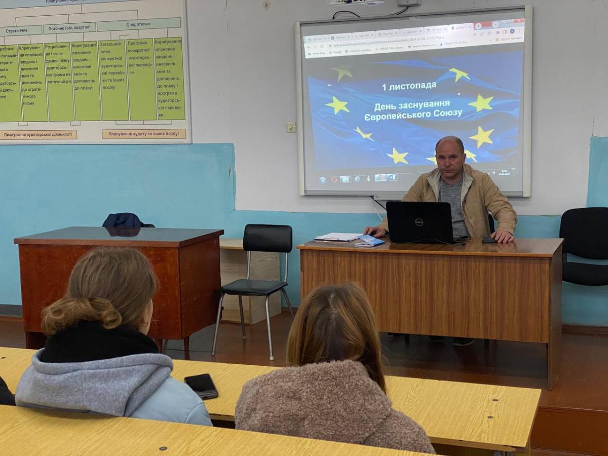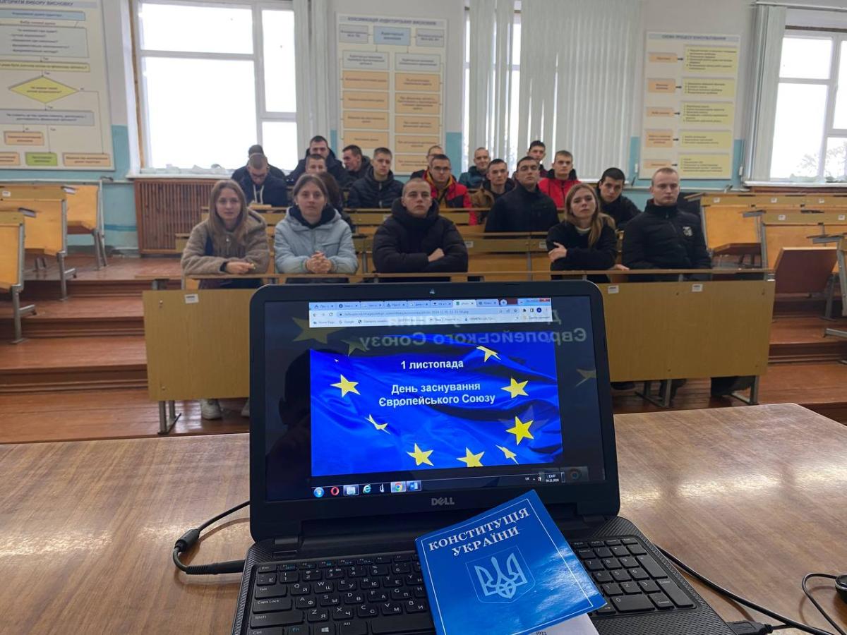 «1 листопада свiтова спільнота вiдзначила День заснування Європейського Союзу. ЄС утворився на основі підписаного 7 лютого 1992 року Маастрихтського договору, який набув чинності 1 листопада 1993 року i який заклав основи існування Єдиної Європи в тому вигляді, в якому ми знаємо її сьогодні», - такими словами старшого викладача кафедри юридичних дисциплін Сумської філії ХНУВС Андрія Сядристого була розпочата кураторська година, присвячена Дню заснування Європейського Союзу.