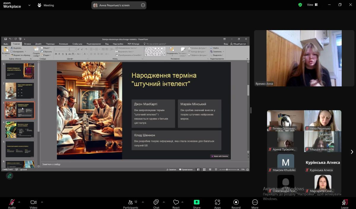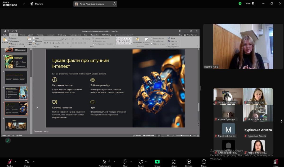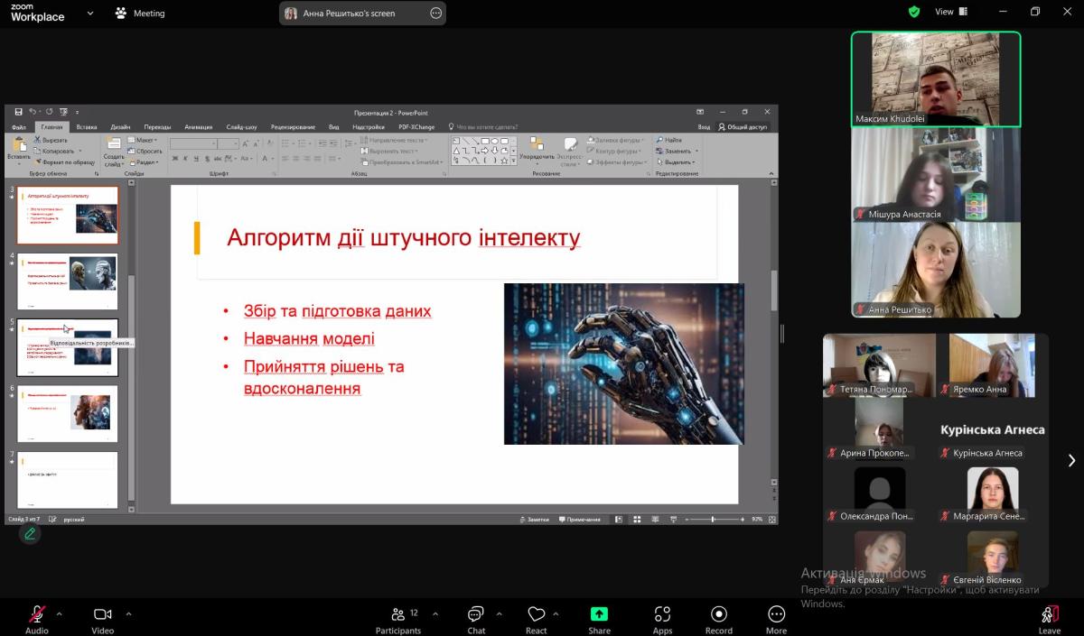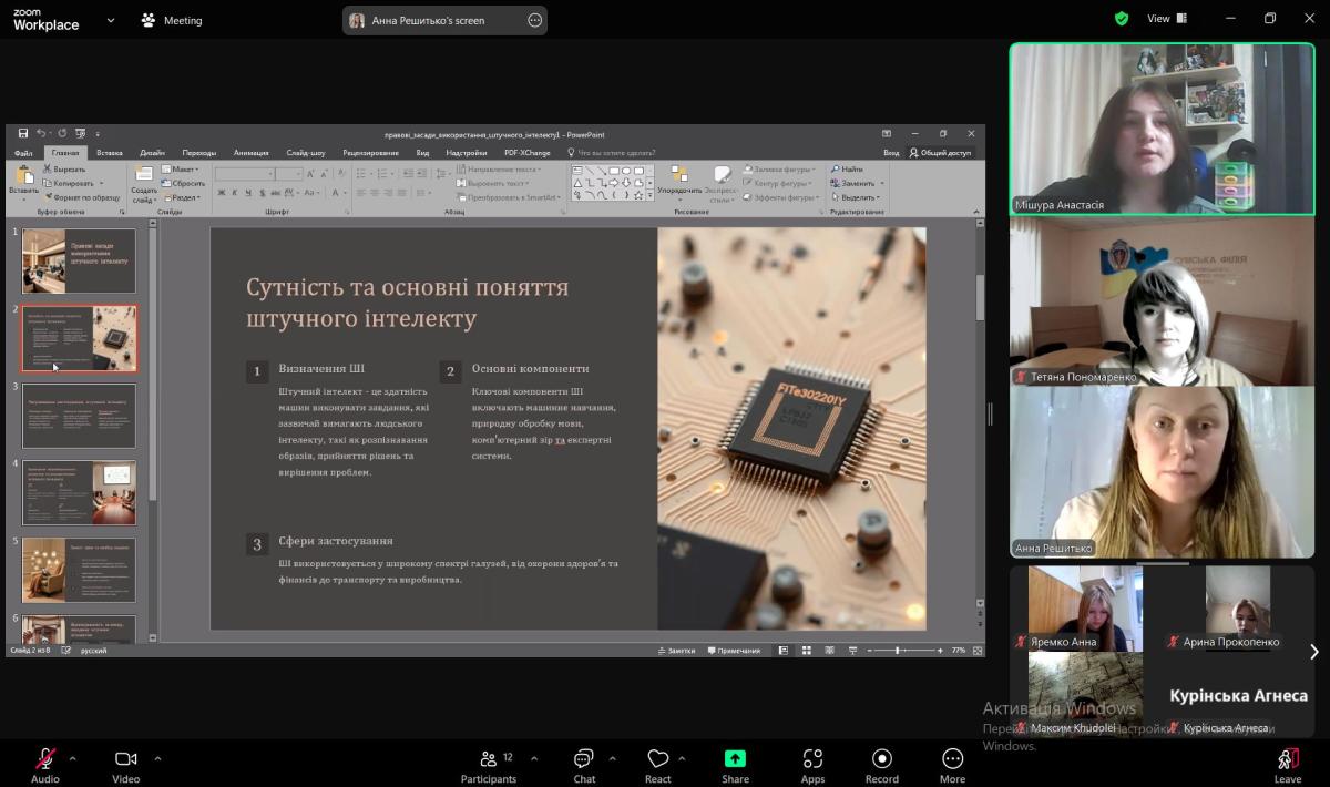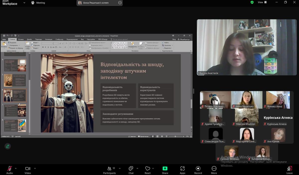 Засідання відкрила керівник гуртка Тетяна Пономаренко, яка підкреслила важливість глибокого розуміння впливу штучного інтелекту на суспільство та правові системи. Під керівництвом викладача Анни Решитько студенти підготували доповіді з тем, які охоплюють різні аспекти штучного інтелекту.