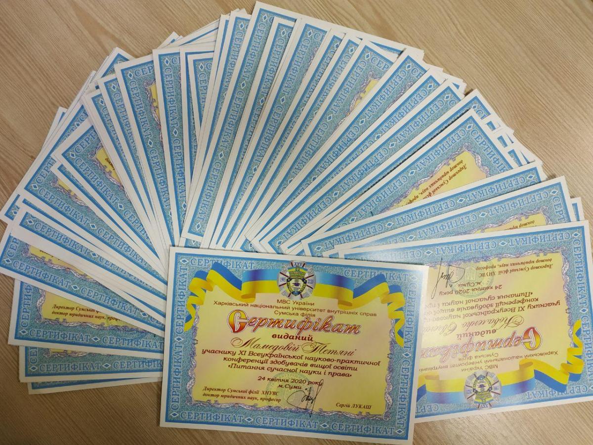 24 квітня 2020 року у Сумській філії ХНУВС у заочно-дистанційній формі відбулася XІ Всеукраїнська науково-практична конференція здобувачів вищої освіти «Питання сучасної науки і права». У роботі конференції взяли участь більше 110 молодих науковців-правників із закладів вищої освіти міста Суми, Харкова, Києва, Дніпра, Львова.