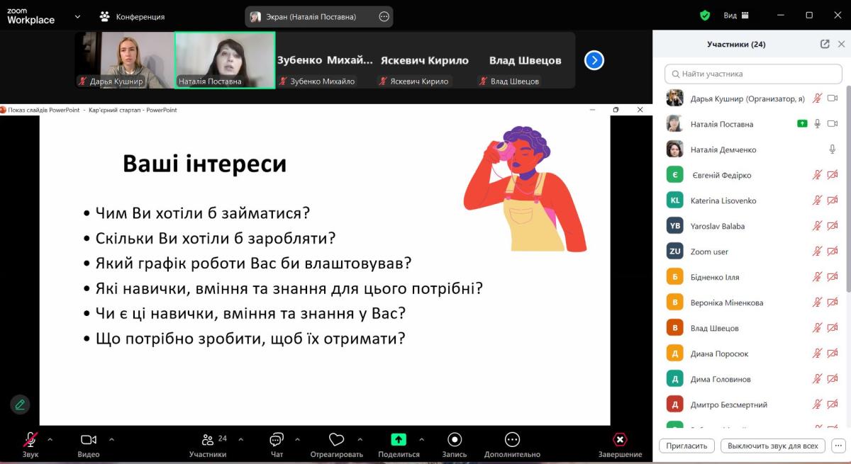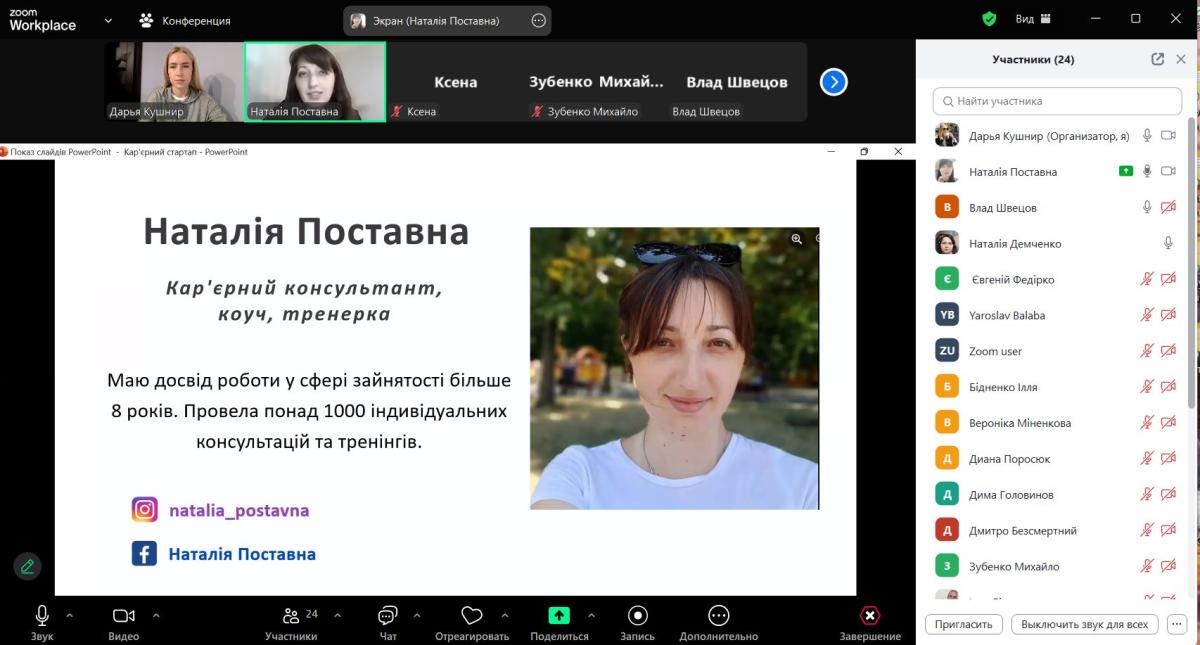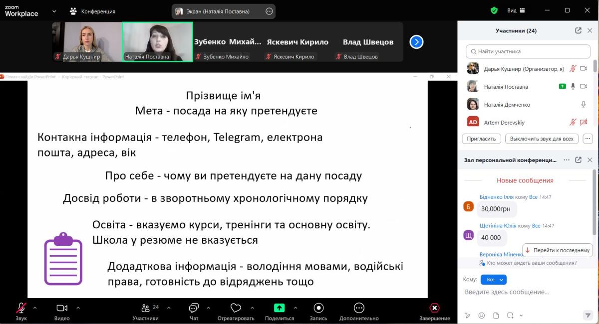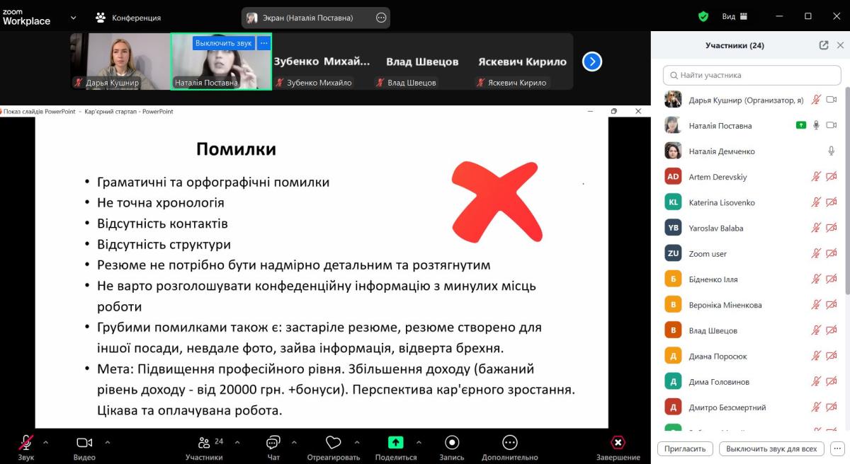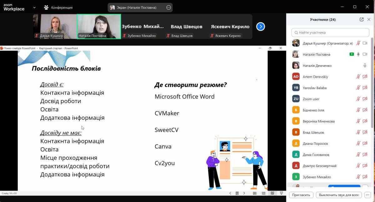 За такою темою відбулось бінарне заняття з навчальної дисципліни «Трудове право» для здобувачів 4 курсу. Його провели кар’єрна консультантка, профорієнтаторка Наталія Поставна та викладач кафедри юридичних дисциплін Сумської філії ХНУВС, кандидат юридичних наук Дар’я Кушнір.