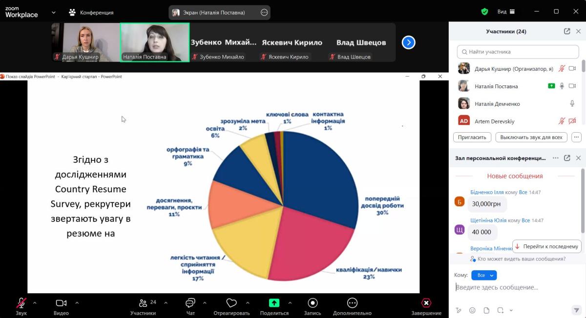 Далі обговорили практичні аспекти працевлаштування, зокрема складання резюме. Резюме розглядади як важливий інструмент для представлення професійних навичок, досвіду роботи та досягнень. Студенти обговорили як правильно структурувати резюме, щоб воно відповідало вимогам роботодавця, і як уникнути типових помилок. Це дозволило зрозуміти, як грамотне складання резюме допомагає працівникові захистити свої інтереси на етапі працевлаштування.