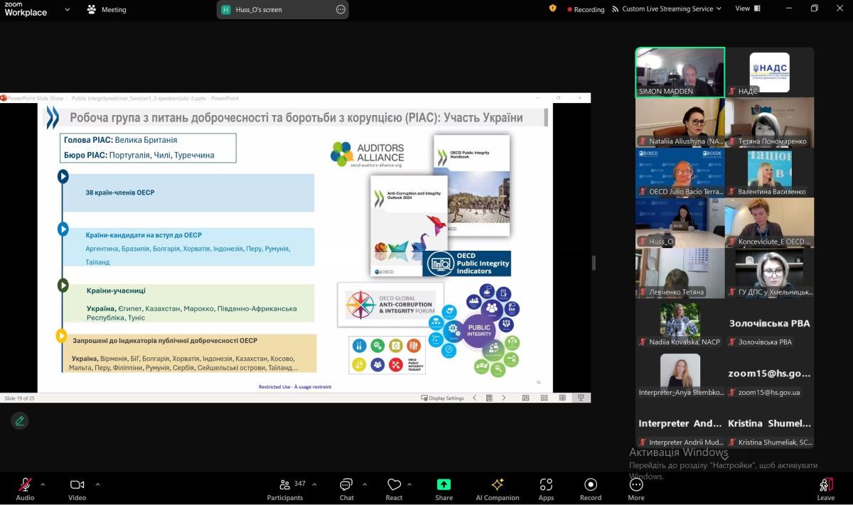 Під час вебінарів, розглянувши теоретичні аспекти, представники Сумської філії ХНУВС долучились до обговорення актуальних питань, як-от: поточний статус співпраці ОЕСР з Україною у сфері доброчесності та боротьби з корупцією; правові інструменти ОЕСР щодо публічної доброчесності; політичне зобов’язання до доброчесності; розподіл обов’язків на всіх рівнях управління для ефективного впровадження системи доброчесності; антикорупційна стратегія, яка ґрунтується на фактах, має чіткий план дій і збалансовує підходи, що базуються на правилах, цінностях і принципах.