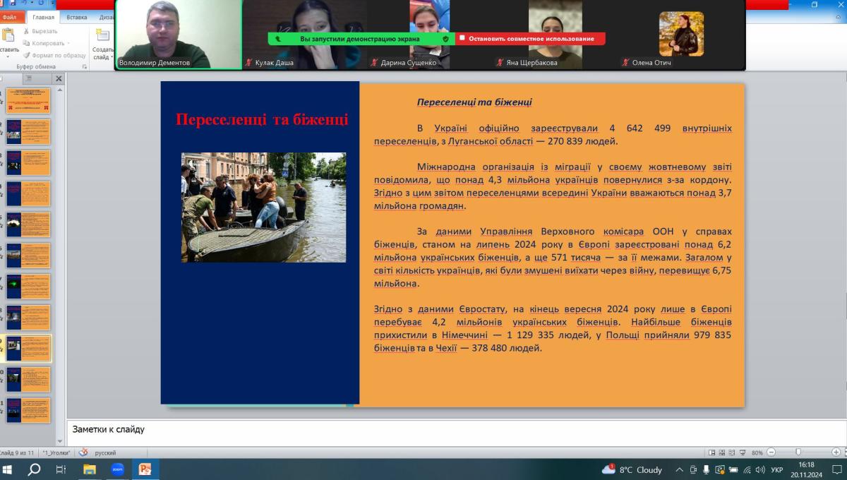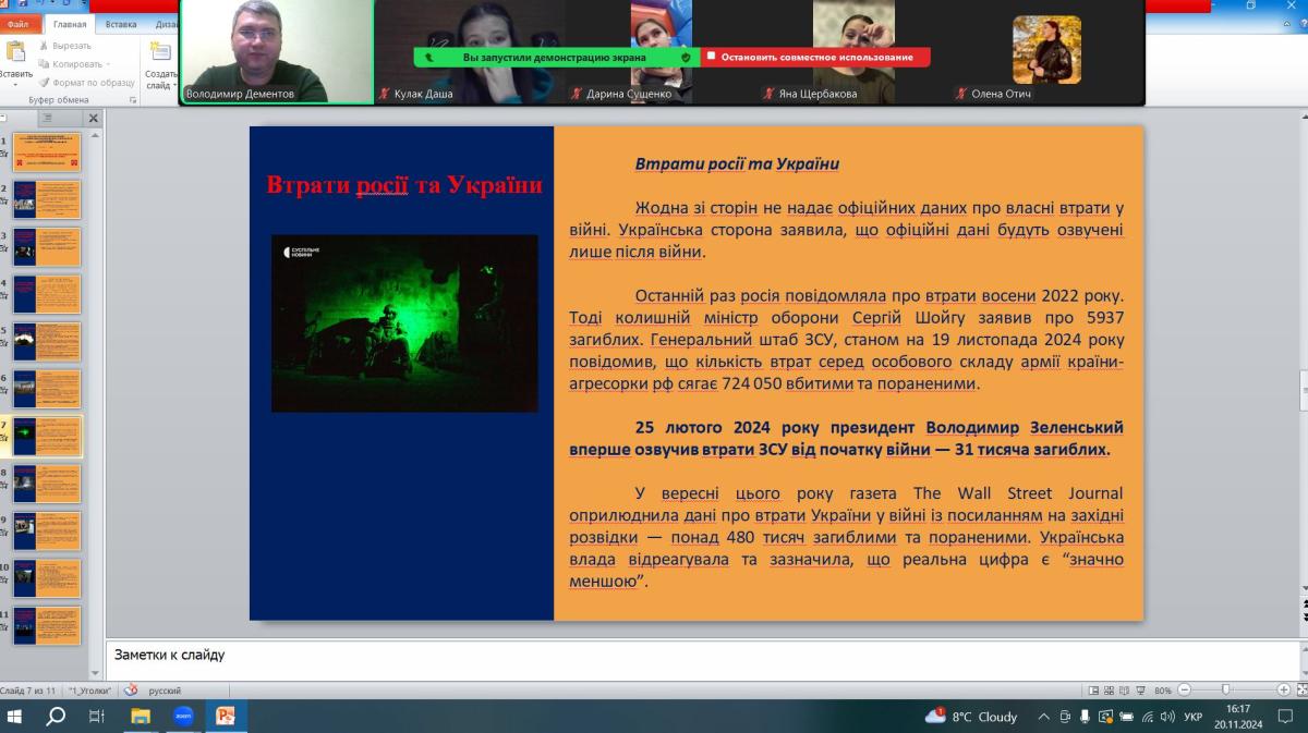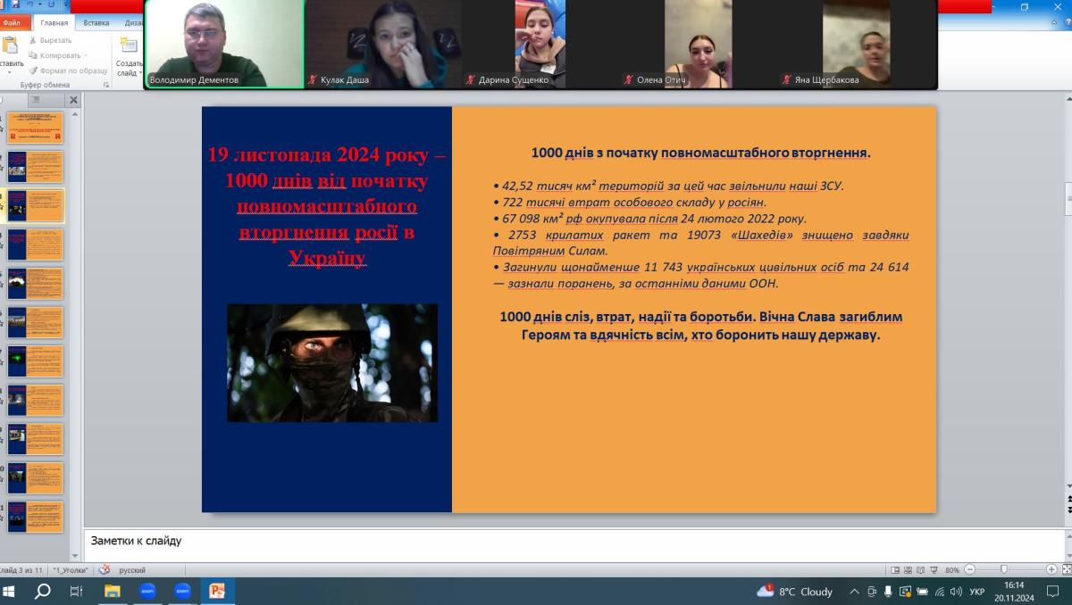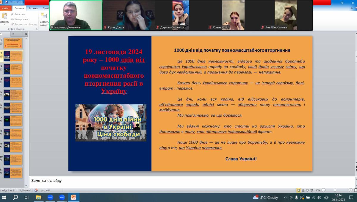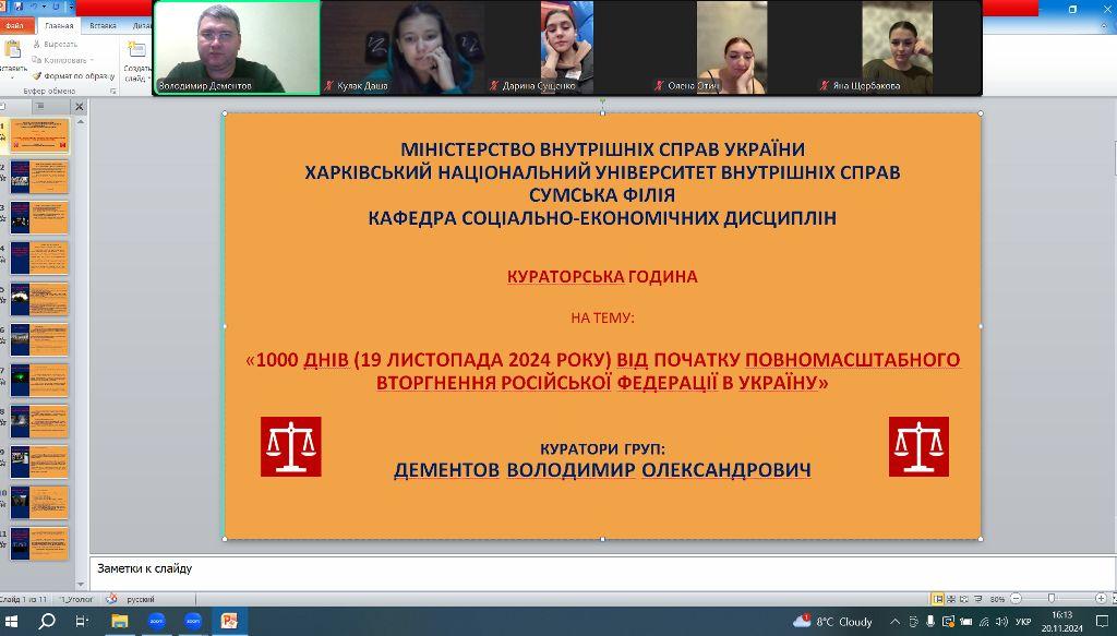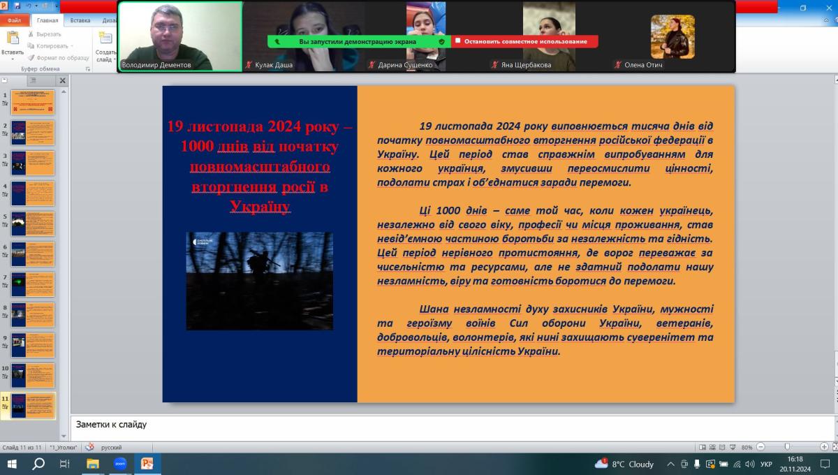 20 листопада 2024 року, згідно з затвердженим планом роботи куратора, доцент кафедри соціально-економічних дисциплін Володимир Дементов провів зі студентами групи СФ-дср-23-2Пд кураторську годину з нагоди відзначення 19 листопада 2024 року дати (тисяча днів) від початку повномасштабного вторгнення російської федерації в Україну.