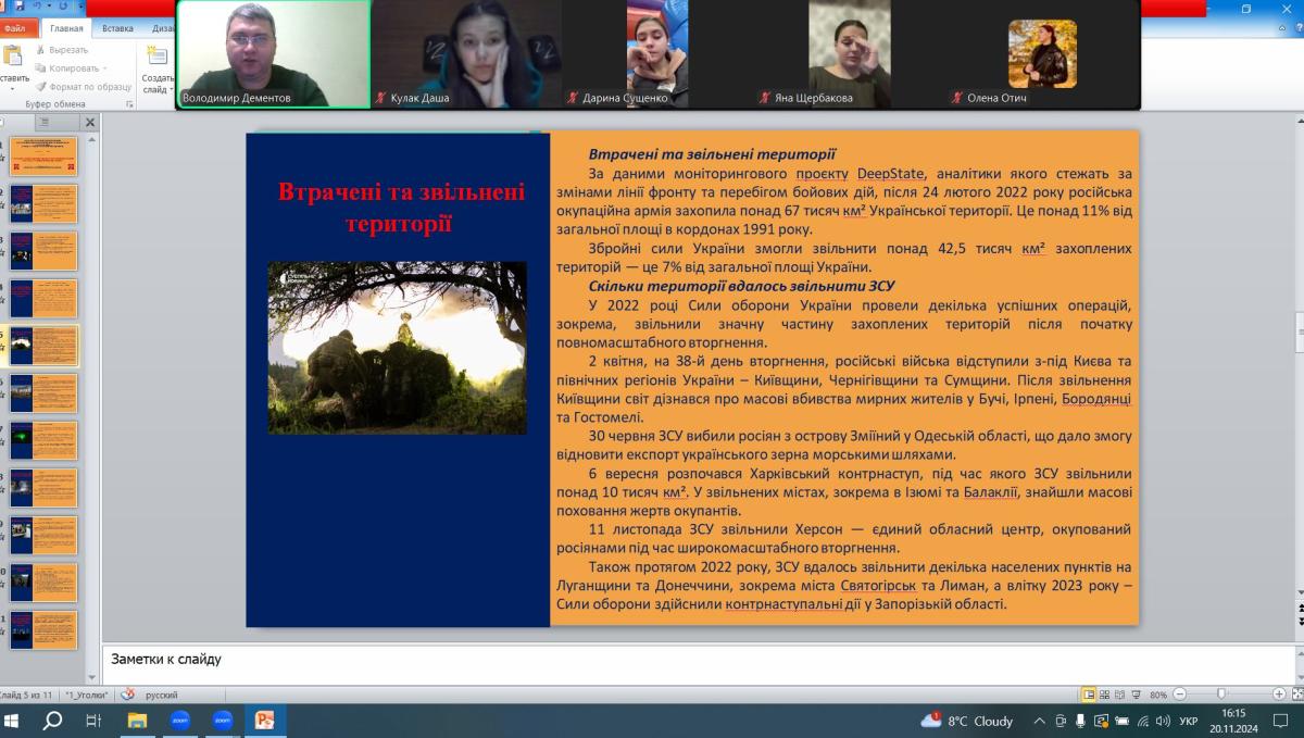 В рамках зустрічі зі студентами 2-го курсу спеціальності «Правоохоронна діяльність» разом згадали трагічні моменти початку повномасштабного вторгнення росії в Україну 24 лютого 2022 року, яке кремль називає “спеціальною військовою операцією”, і якому передувало визнання росією псевдореспублік “ЛНР” і “ДНР” та нарощування військ на кордонах України у 2021 році.