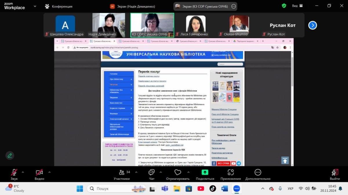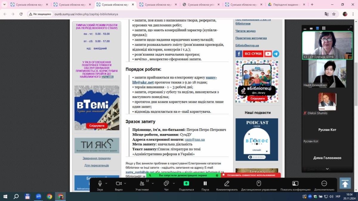 Завідувачка відділу інформаційних комунікацій і баз даних Сумської обласної наукової бібліотеки Людмила Панкратова, яка приєдналася до проведення науково-практичного заходу, зосередила увагу на електронних інформаційних ресурсах, які здобувачі можуть використовувати в освітньому процесі. Зокрема, цінним ресурсом для пошуку наукової літератури для написання тез, статей, курсових робіт є електронні каталоги наукових бібліотек України, до яких прикріплені оцифровані повтотекстові документи. Людмила Панкратова повідомила, що для написання курсових робіт можна скористатися послугами «віртуальної довідкової служби» бібліотек для замовлення списків літератури в режимі онлайн, дистанційному замовленні книг, статей і інших документів.