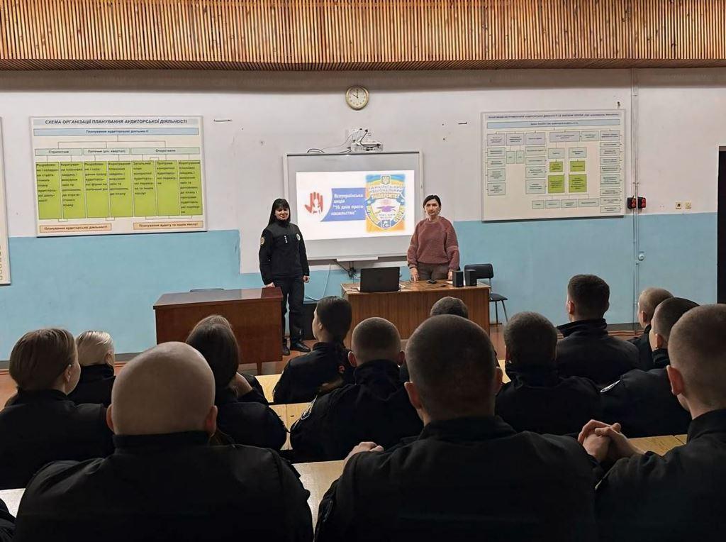 Під час заняття майбутні правоохоронці дізналися про мету кампанії — підвищення обізнаності суспільства щодо проблеми насильства, захист постраждалих та формування нульової толерантності до всіх форм насильства. Учасники обговорили важливість захисту прав людини, боротьби з гендерною дискримінацією, торгівлею людьми та іншими видами насильства. Особливу увагу було приділено правовим аспектам реагування на випадки домашнього насильства та насильства за ознакою статі, важливістю формування довіри між правоохоронними органами та громадянами.