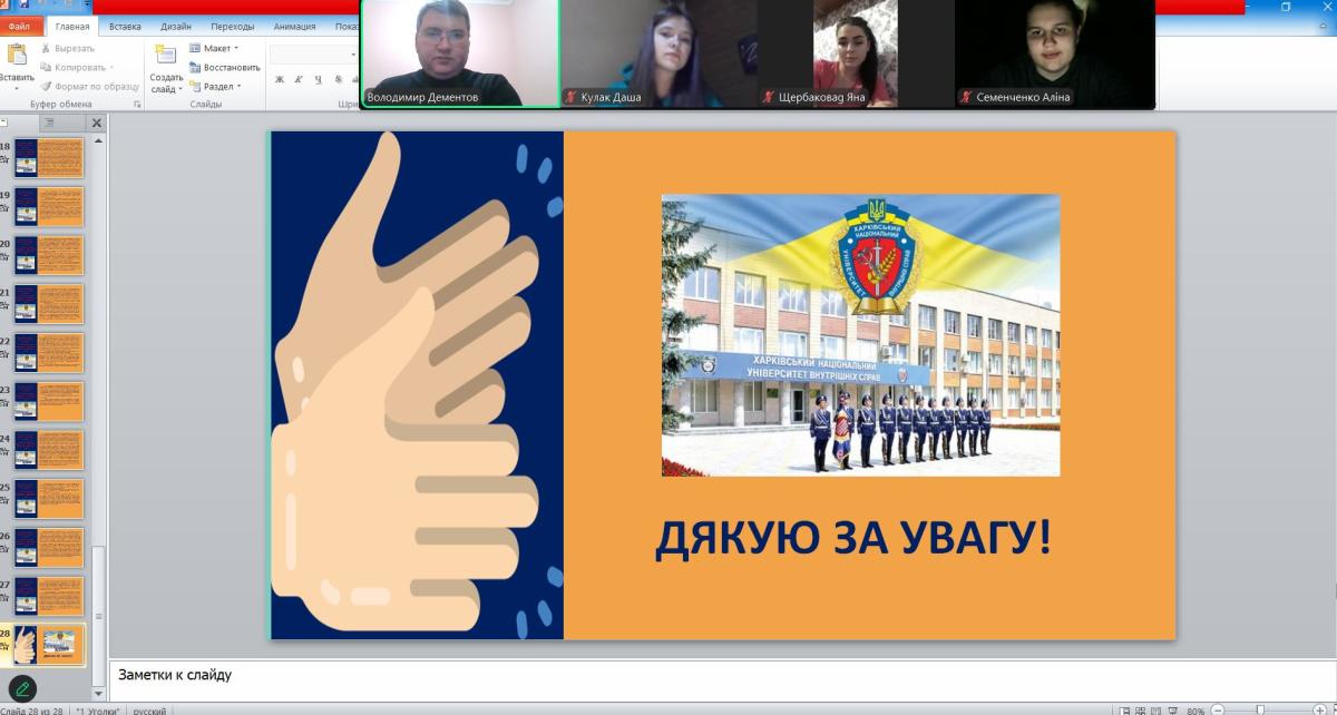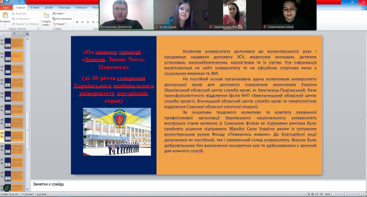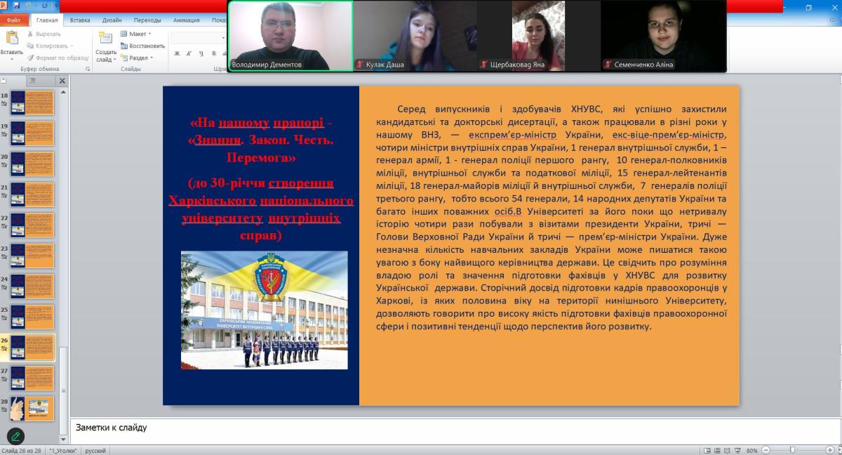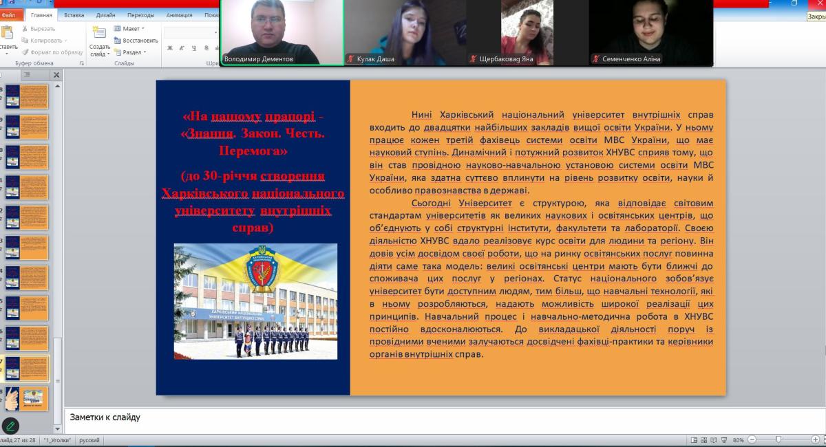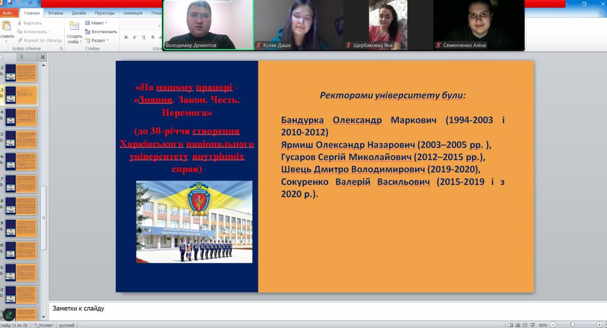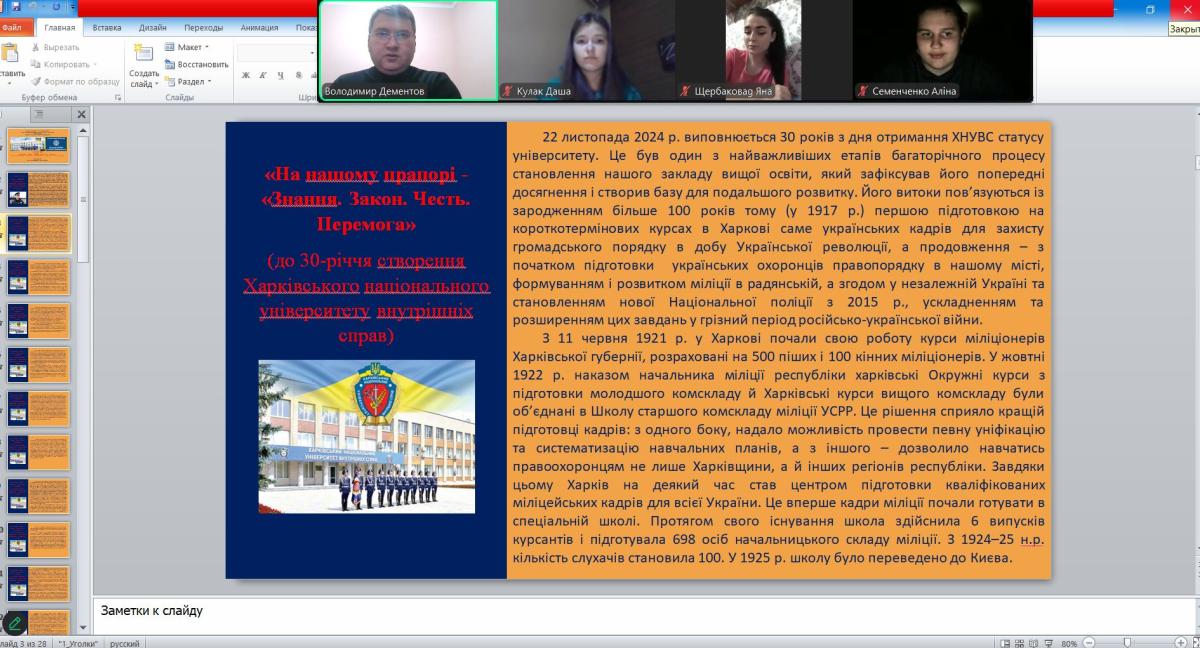 В рамках лекції студенти 2-го курсу спеціальності «Правоохоронна діяльність» ознайомились зі славетною історією створення та розвитку Університету, з величезними здобутками у науковій, освітянській, правоохоронній галузі, активною та незламною, націленою на допомогу захисту України та наближення нашої перемоги, життєдіяльністю Університету в умовах війни, згадали всіх ректорів Університету, численних славетних випускників – науковців, державних діячів, керівників правоохоронних структур, героїв-захисників вітчизни.
