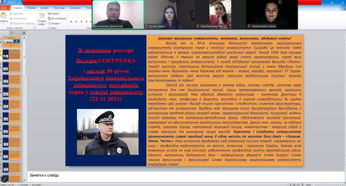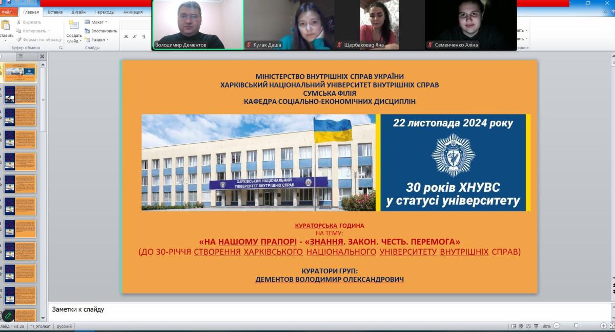 На виконання п. 8 Плану заходів ХНУВС до 30-ти річчя створення університету та згідно з затвердженим планом роботи куратора, доцент кафедри соціально-економічних дисциплін Володимир Дементов провів для студентів групи СФ-дср-23-2Пд лекцію до 30-річчя створення Харківського національного університету внутрішніх справ.