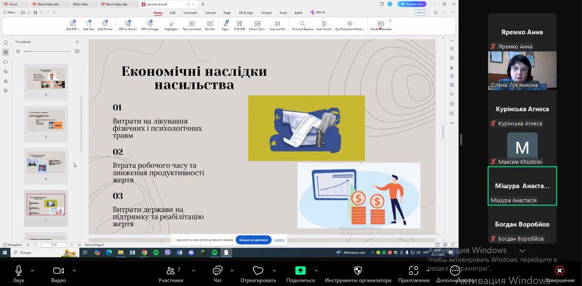 Триває проведення заходів у межах Всеукраїнської кампанії «16 днів проти насильства». Запобігання насильству та ідентифікація цієї проблеми серед оточення є важливою складовою роботи науково-педагогічного працівника. У зв’язку з цим 25 листопада 2024року професор кафедри соціально-економічних дисциплін Олена Лук’янихіна провела тематичну лекцію-бесіду із студентами-першокурсниками, майбутніми юристами, на тему: «Домашнє насильство – характеристика, види, негативний вплив на соціум, приклади по Україні методи та механізми запобігання».