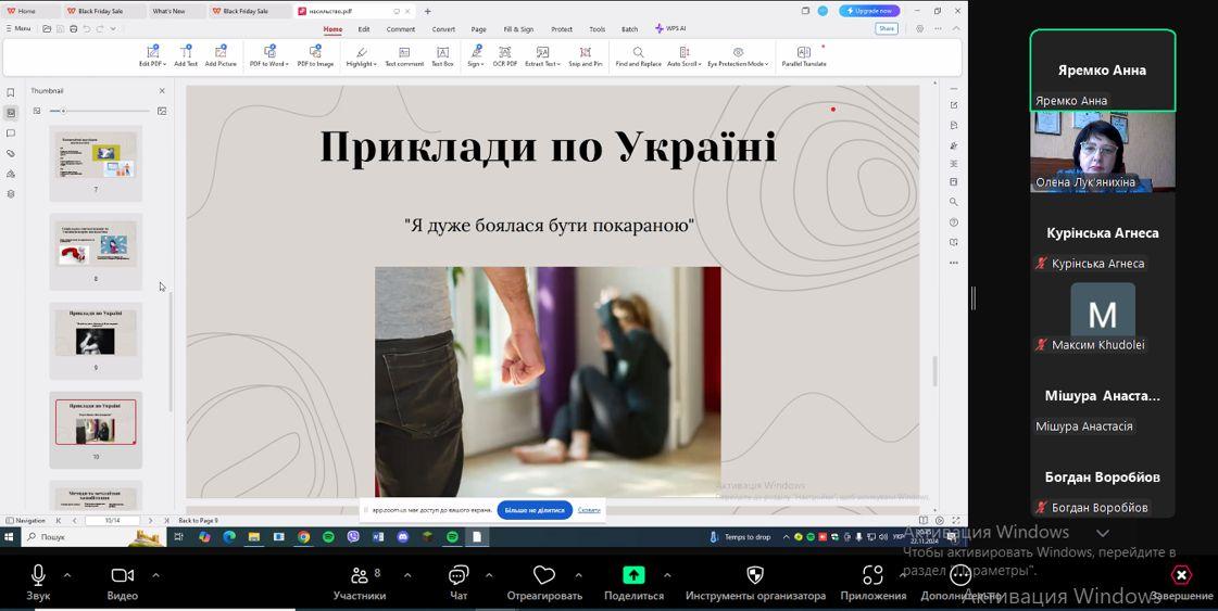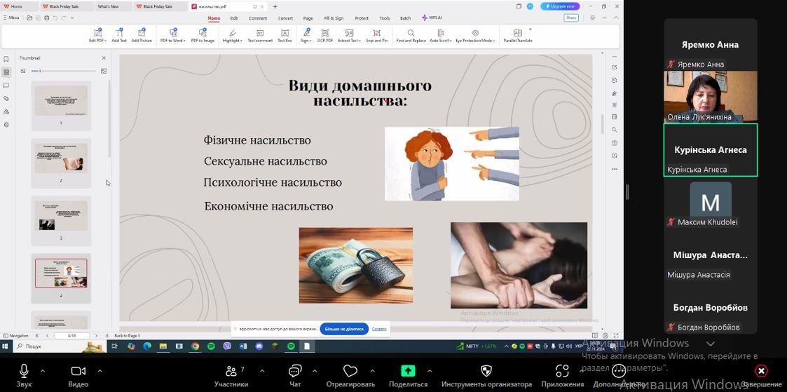 Розглянули характерні особливості і конкретні алгоритми допомоги потерпілим від різних видів насильства – психологічного, економічного, фізичного, сексуального, методах профілактики, повноваження органів, які є дотичними до цієї проблематики і відіграють значну роль у виявленні і допомозі такій категорії людей.