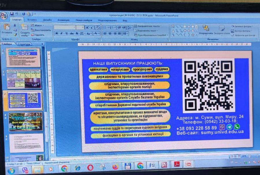 Наголосивши на ролі якісної юридичної освіти, доповідачі змогли донести до старшокласників важливість фінансової незалежності, безпеки та професійної самореалізації через здобуття вищої освіти, зосередивши увагу аудиторії на перспективах працевлаштування після навчання у Сумській філії ХНУВС за спеціальностями 081 Право і 262 Правоохоронна діяльність.