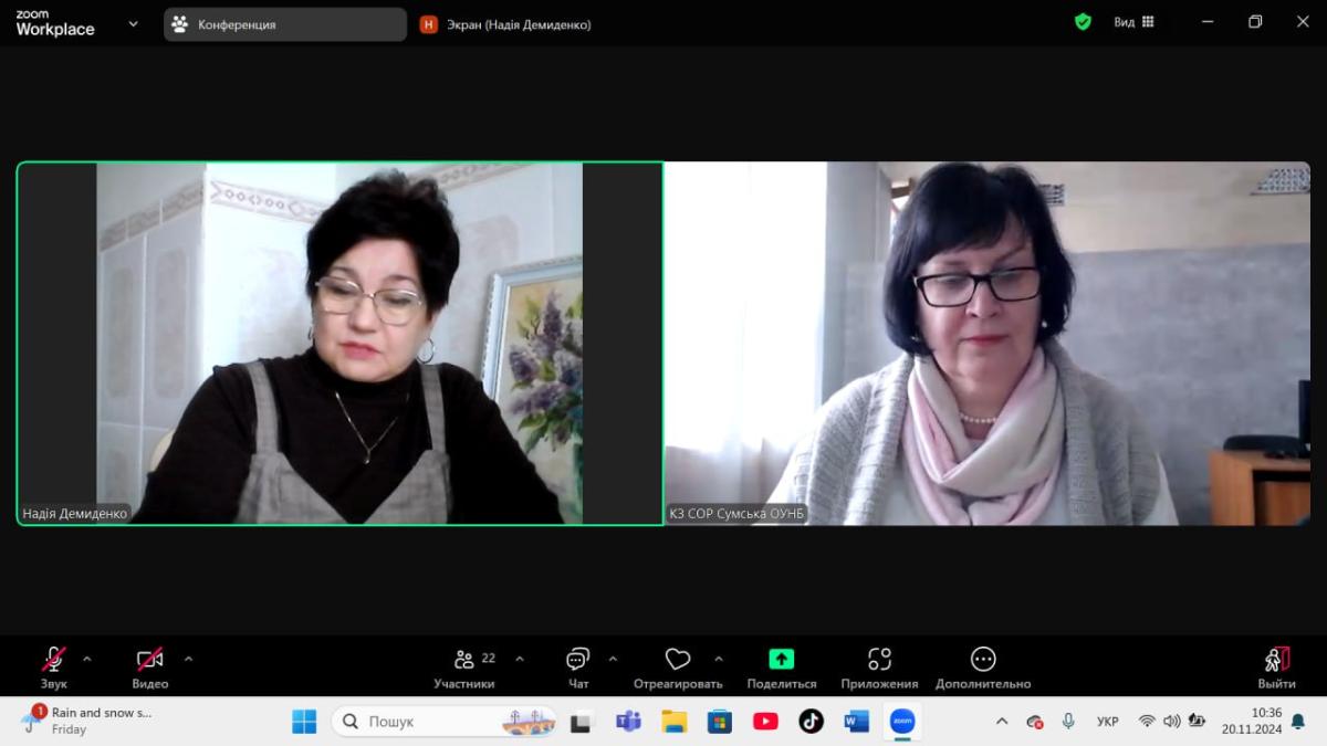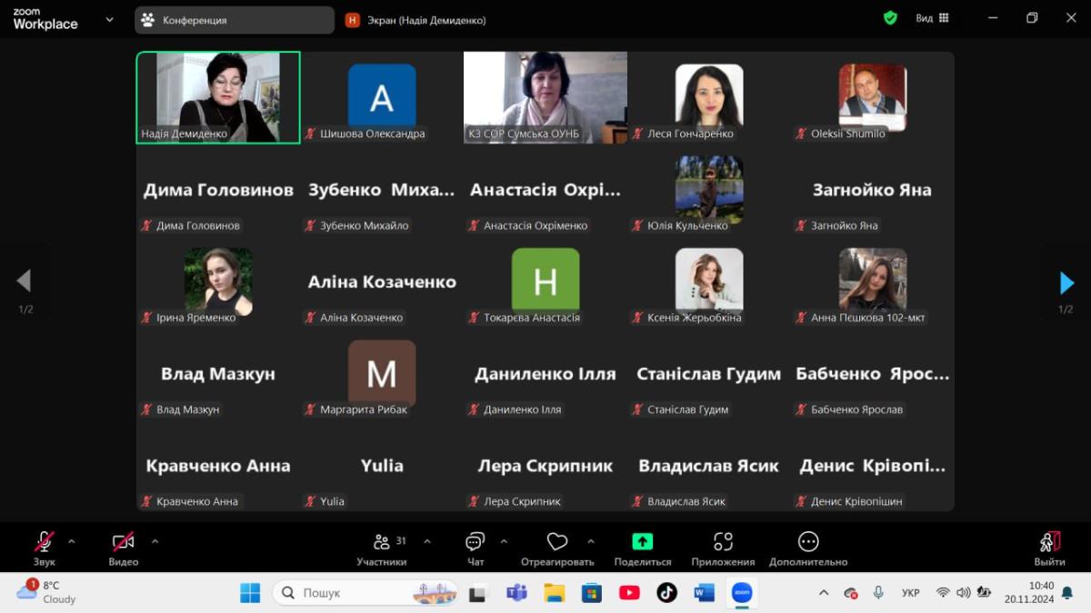 Завідувачка відділу інформаційних комунікацій і баз даних Сумської обласної наукової бібліотеки Людмила Панкратова, яка приєдналася до проведення науково-практичного заходу, зосередила увагу на електронних інформаційних ресурсах, які здобувачі можуть використовувати в освітньому процесі. Зокрема, цінним ресурсом для пошуку наукової літератури для написання тез, статей, курсових робіт є електронні каталоги наукових бібліотек України, до яких прикріплені оцифровані повнотекстові документи. Людмила Панкратова повідомила, що для написання курсових робіт можна скористатися послугами «віртуальної довідкової служби» бібліотек для замовлення списків літератури в режимі онлайн, дистанційному замовленні книг, статей і інших документів.