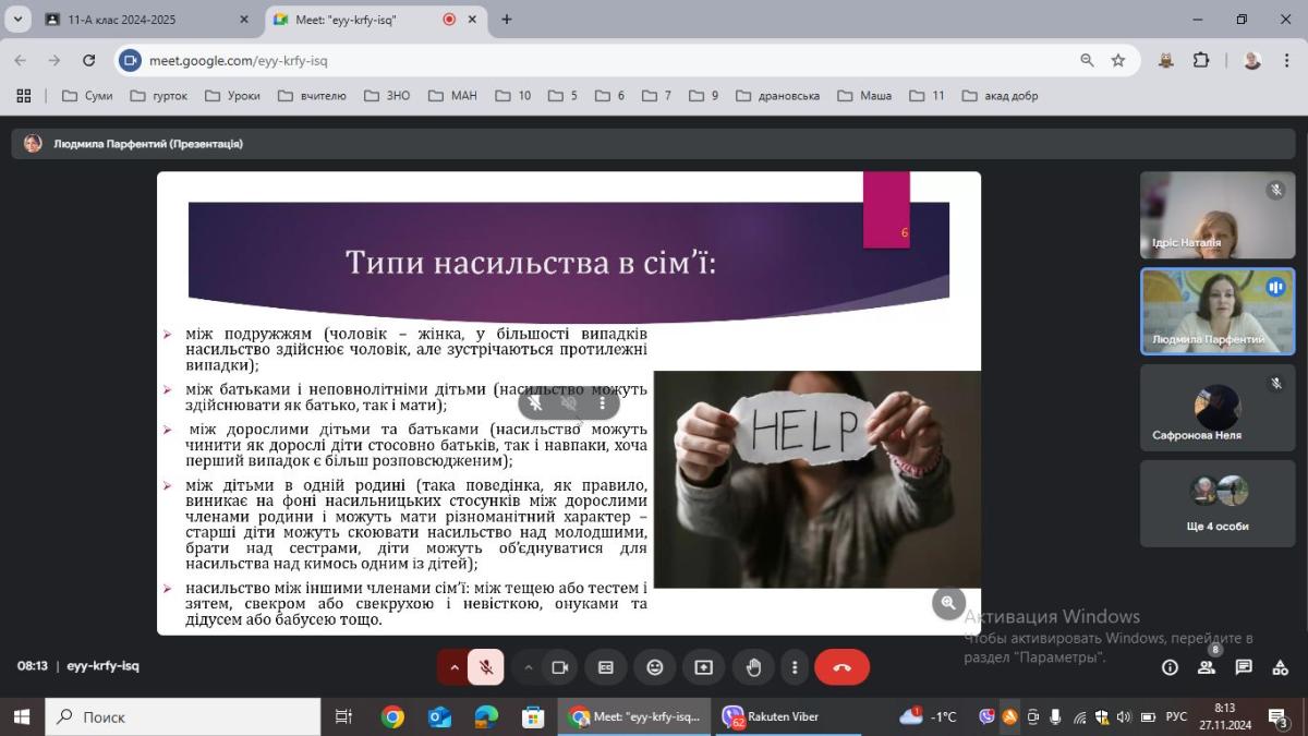 У рамках Всеукраїнської акції “16 днів проти насильства” доцент кафедри соціально-економічних дисциплін Сумської філії ХНУВС Людмила Парфентій прочитала лекцію для учнів 11 класу Сумської загальноосвітньої школи І-ІІІ ступенів №4 імені Героя України Олександра Аніщенка на тему «Домашнє насильство: відповідальність і протидія». Було розглянуто типи та основні ознаки насильства в сім’ї, а також зазначено відповідальність, яку несуть особи, що вчинили домашнє насильство та насильство за ознакою статі.