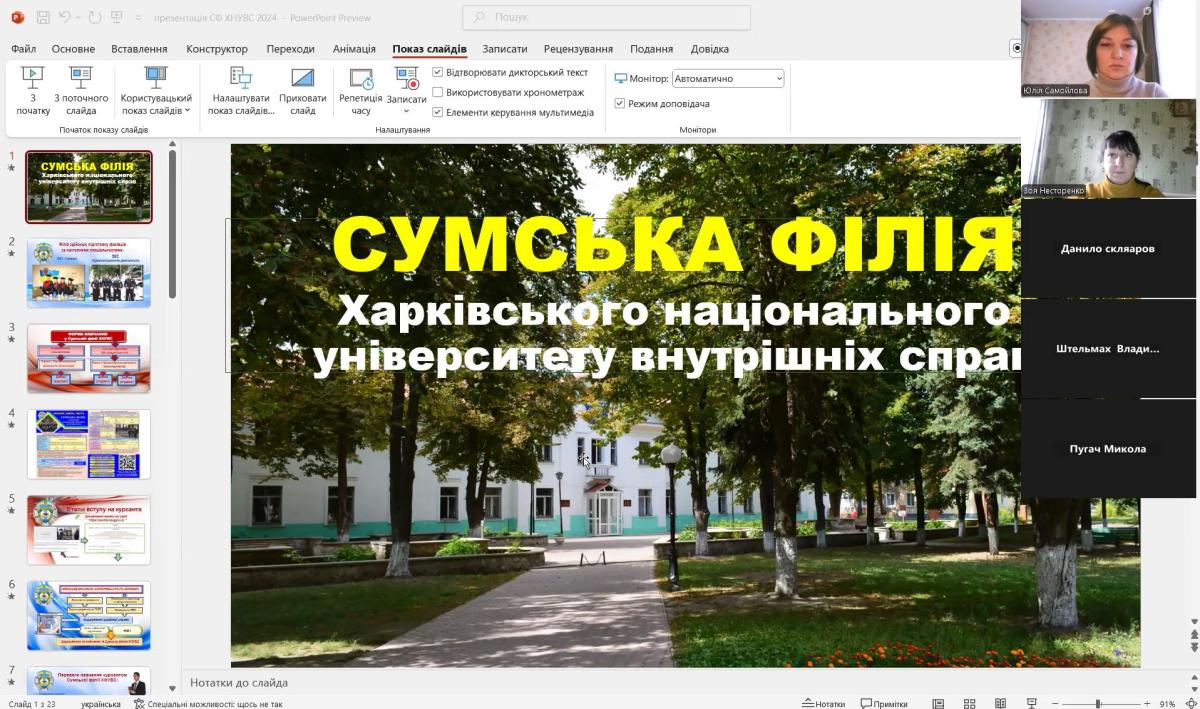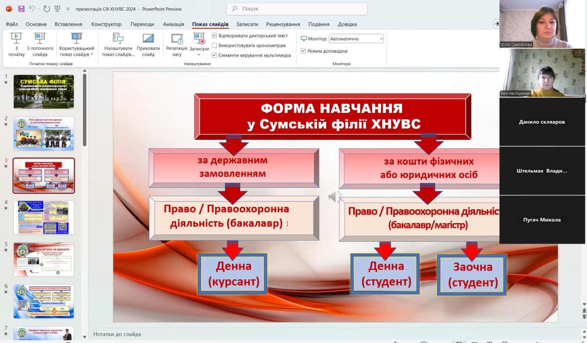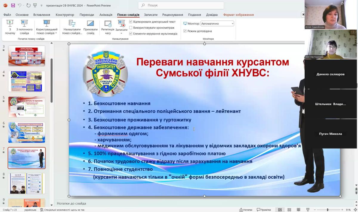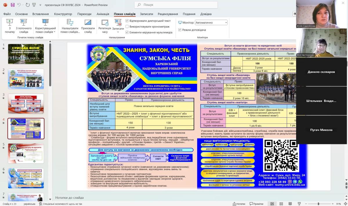 Також, під час зустрічі учнів ознайомили із основними спеціальностями, за якими можна отримати освіту у Сумській філії ХНУВС, особливостями вступу та навчання в університеті. Обговорили також переваги юридичної професії у сучасному світі.
