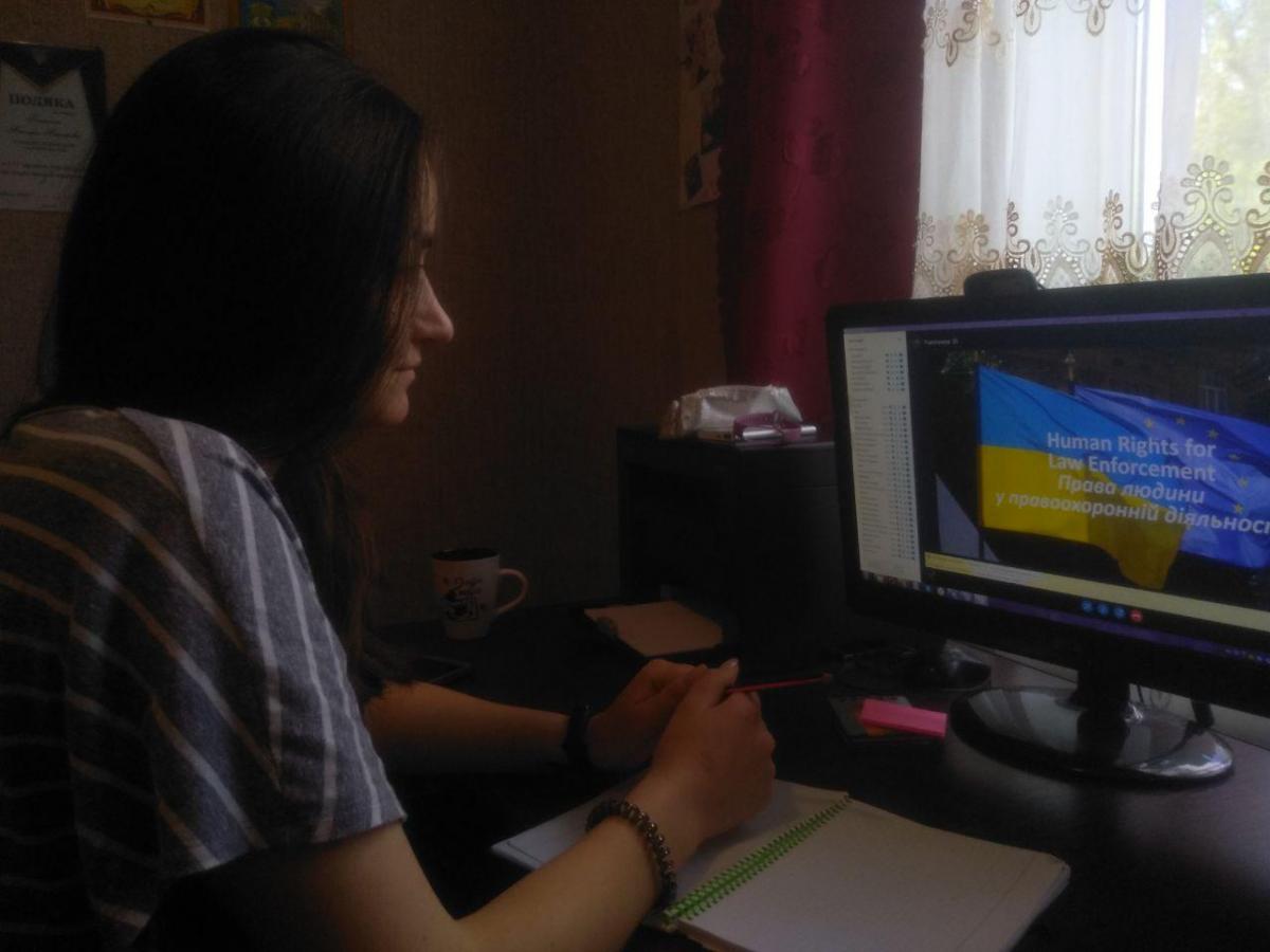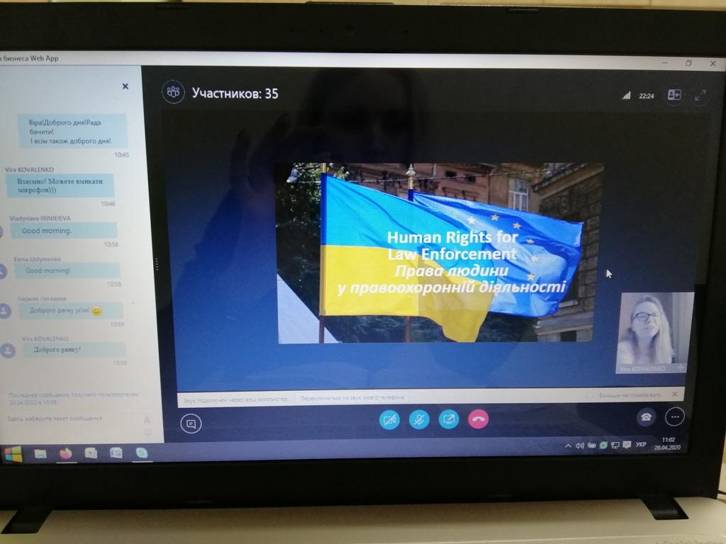 Перебуваючи вдома, дотримуючись всіх карантинних правил, студентки Сумської філії Панасенко Вікторія, Чабаненко Аліна, Кисіленко Анастасія спільно з викладачем кафедри юридичних дисциплін Цвітаною Барановою прийняли участь у вебінарі англійською мовою «Права людини у правоохоронній діяльності», під час якого радник з питань верховенства права, юрист Sear Ammar (Німеччина) поділився практичним досвідом з даної тематики.