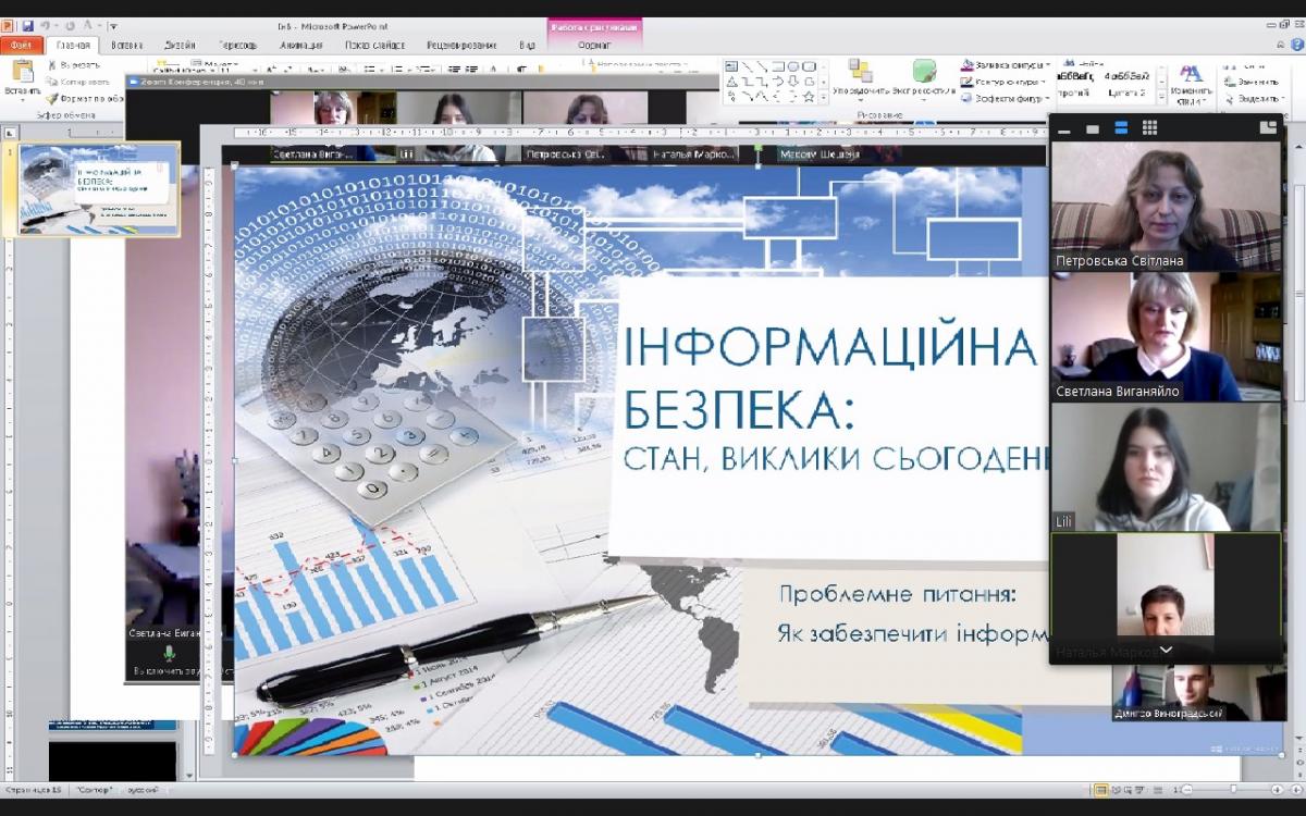 29 квітня 2020р. за планом роботи студентського наукового гуртка кафедри соціально-економічних дисциплін Сумської філії ХНУВС «Актуальні проблеми розвитку національної економіки в умовах глобалізації» був проведений круглий стіл «Інформаційна безпека: стан, виклики сьогодення». Особливості проведення освітнього процесу в умовах карантину спонукали учасників круглого столу зустрітися і обговорити нагальні питання інформаційної безпеки у форматі відеоконференції (модератор заходу – доцент кафедри, кандидат економічних наук Виганяйло Світлана Миколаївна).