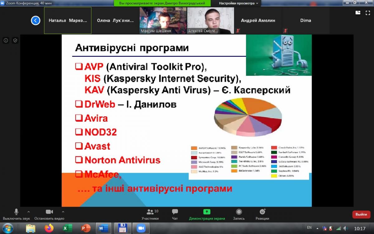 Виноградський Дмитро − курсант 1 курсу групи СФ-103. тема доповіді: «Комп'ютерний вірус і антивірусні програми».