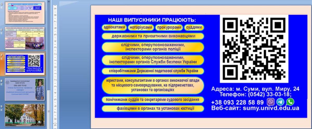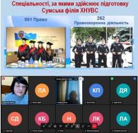 Інформацію про спеціальності, за якими здійснюється підготовка фахівців у Сумській філії ХНУВС за кошти держбюджету (курсант) та за контрактом, можливості працевлаштування і побудови кар’єри після отримання диплома бакалавра, було доведено до аудиторії із застосуванням презентаційних матеріалів.