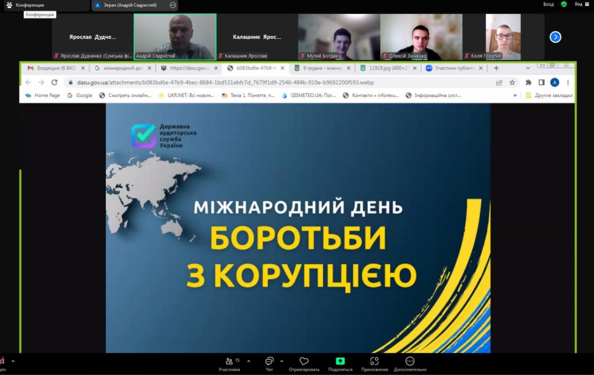 Старший викладач кафедри юридичних дисциплін Сумської філії ХНУВС Андрій Сядристий разом з курсантами групи СФ-23-1Пд провів кураторську годину до Міжнародного дня боротьби з корупцією, який з ініціативи ООН щорічно відзначається 9 грудня. В цей день в 2003 році була відкрита для підписання Конвенція ООН проти корупції, прийнята Генеральною асамблеєю ООН 1 листопада 2003 року. Понад 100 держав, що підписали Конвенцію, визнали підкуп, хабар перевищення владних повноважень та інші зловживання становищем кримінальними злочинами, а також прийняли рішення співпрацювати з метою масштабної боротьби проти корупції.