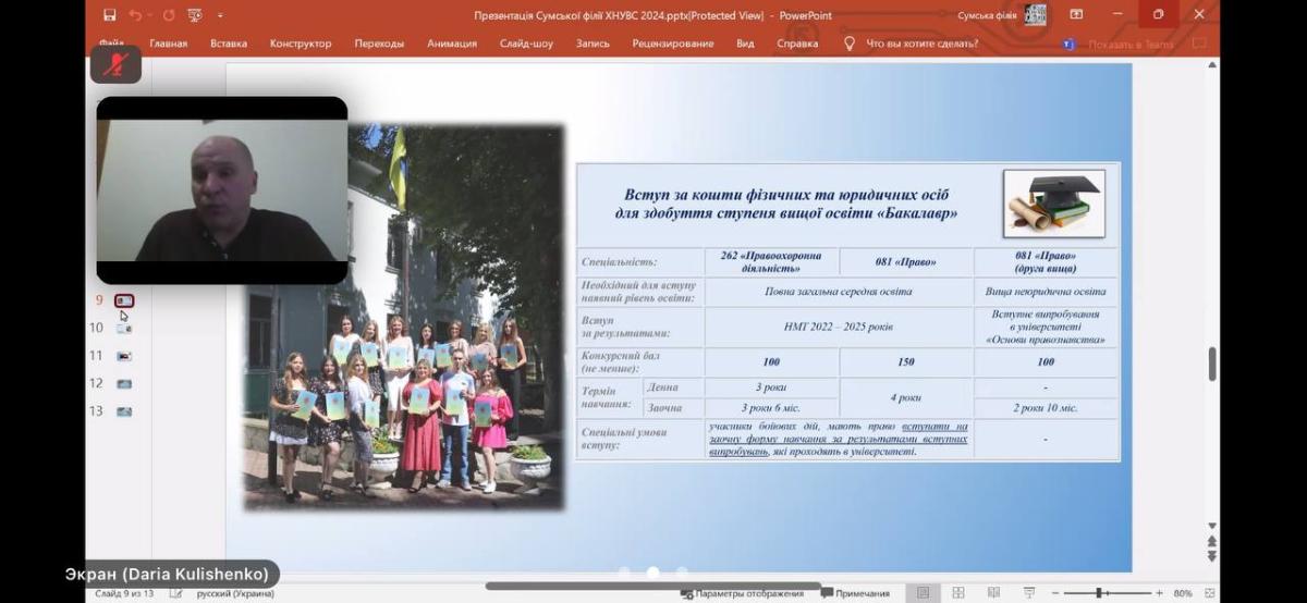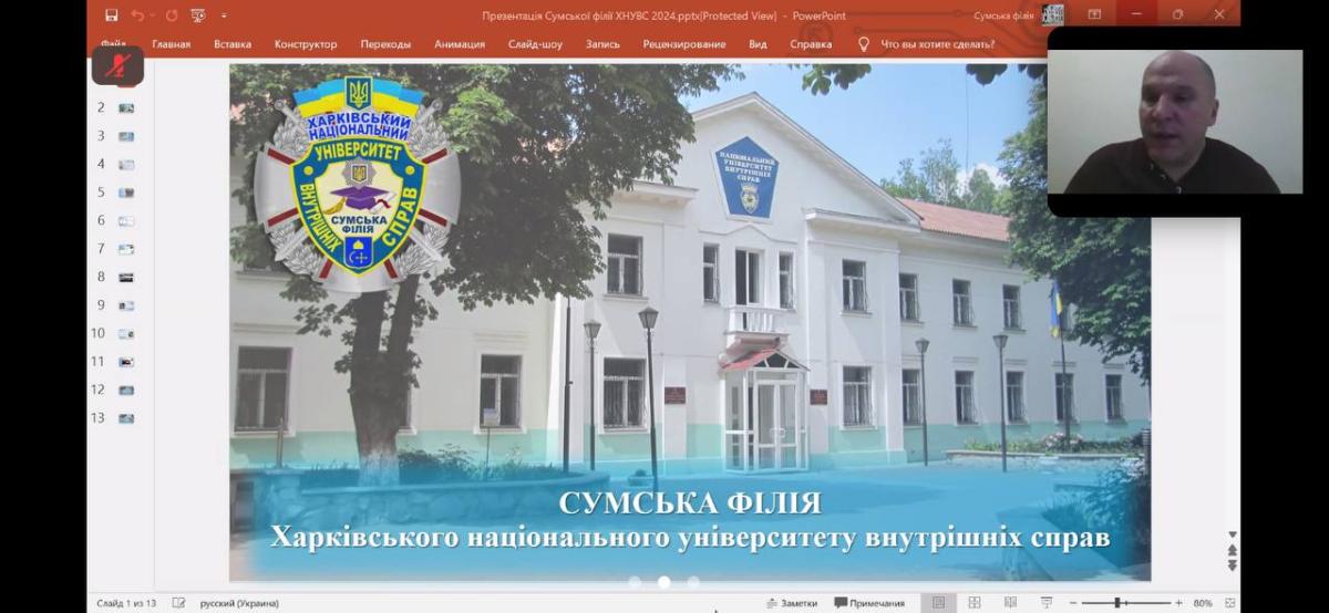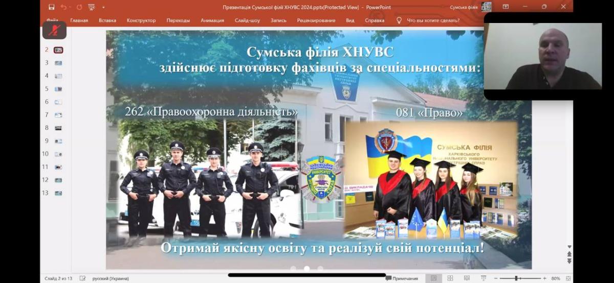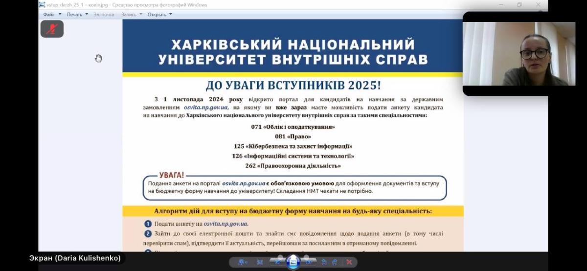 Старший викладач кафедри юридичних дисциплін Андрій Сядристий, провідний фахівець групи документування службової діяльності Дар’я Кулішенко та курсант першого курсу Даниіл Іванчихін провели онлайн-зустріч із учнями КУ Сумської ЗОШ № 23 м. Суми.