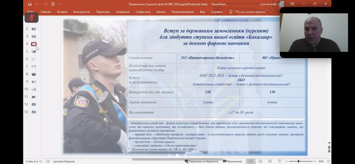 Під час заходу представники Сумської філії ХНУВС детально розповіли про умови вступу до Харківського національного університету внутрішніх справ та його Сумської філії. Учні дізналися про основні етапи вступної кампанії, перелік необхідних документів, вимоги до фізичної підготовки та складання вступних іспитів.