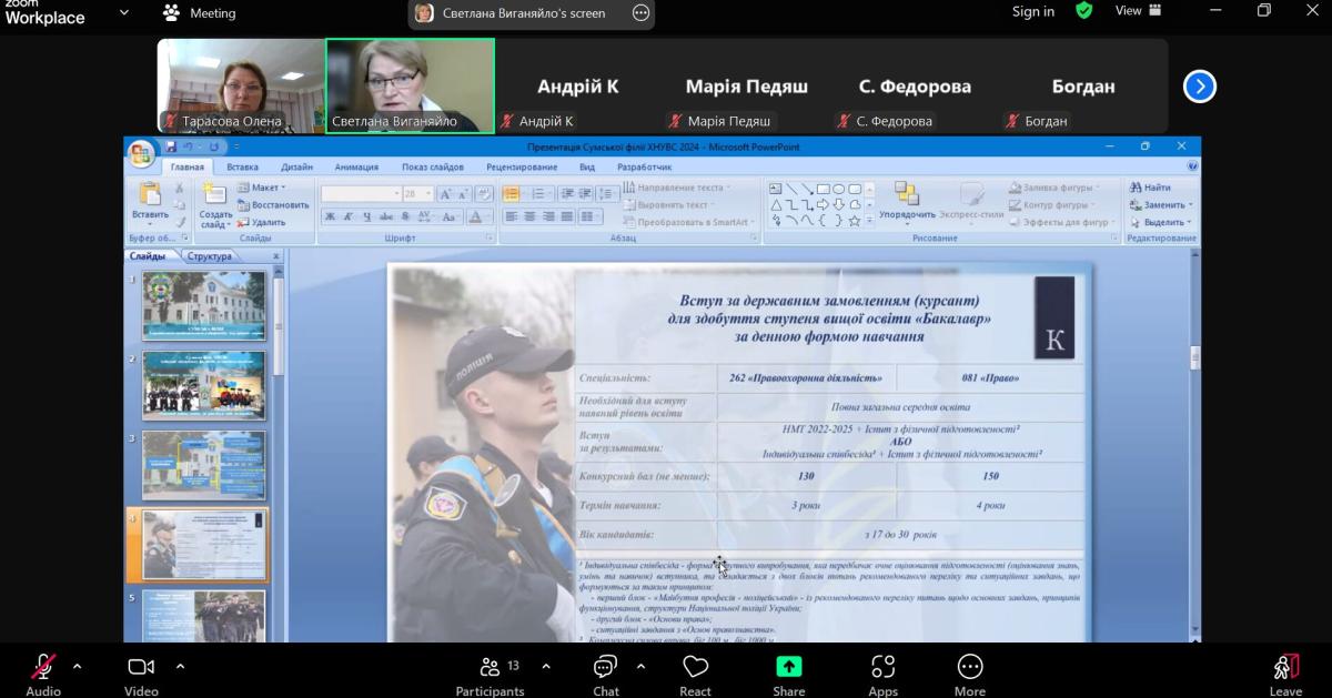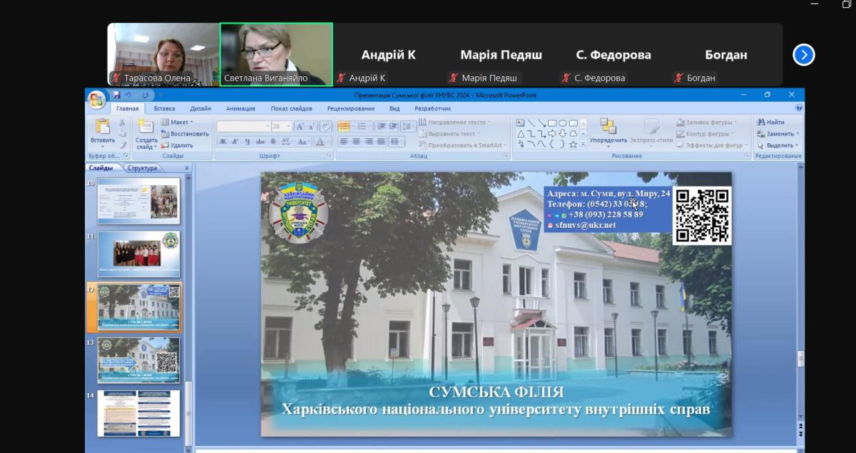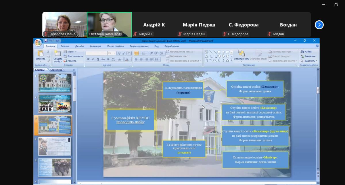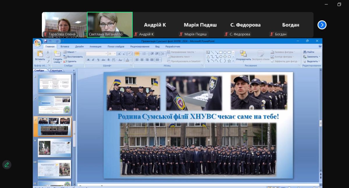 Завідувачка кафедри соціально-економічних дисциплін Сумської філії ХНУВС Світлана Виганяйло провела профорієнтаційну бесіду з представниками Ліцею №2 м. Путивль. Вона познайомила потенційних абітурієнтів з Харківським національним університетом внутрішніх справ – потужним центром підготовки кадрів для Національної поліції України за всіма світовими стандартами, та його Сумською філією.
