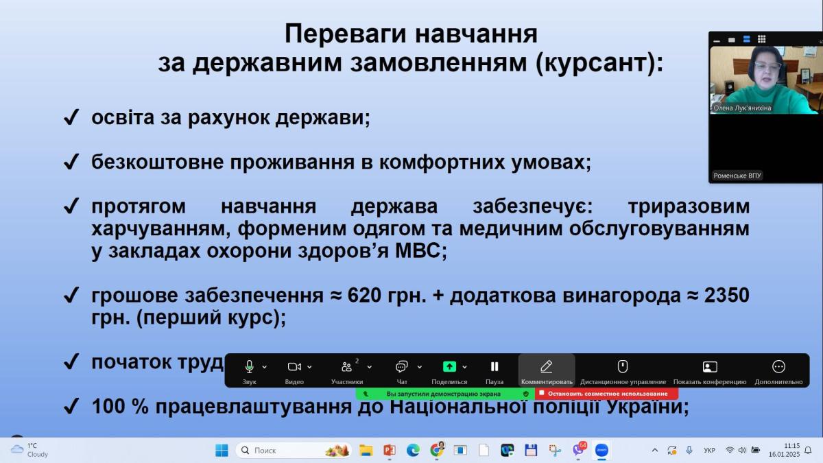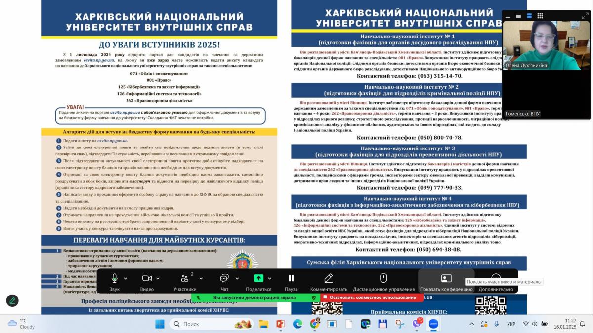 Особливу увагу доповідач приділила саме підготовці курсантів і наголосила на тому, що перший етап вступу – подача анкет на сайті Національної поліції триває з листопада 2024 року. Про особливості проходження етапів для вступу на місця державного замовлення у заклади освіти системи МВС, їх терміни і вимоги присутні мали можливість дізнатися із розповіді і презентації. Усі охочі отримали вичерпні відповіді на запитання за темою заходу.