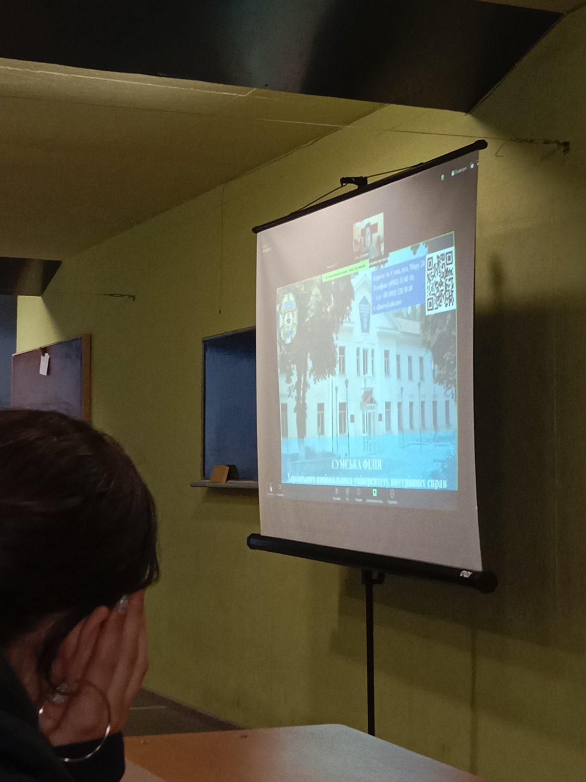 До присутніх було доведено інформацію про спеціальності 081 Право та 262 Правоохоронна діяльність, за якими відбувається підготовка фахівців у Сумській філії ХНУВС – загальні вимоги щодо вступу, переваги навчання у закладі системи МВС, перспективи працевлаштування. Також Олена Анатоліївна розповіла про курсантсько-студентське життя і наукові, позанавчальні заходи, які проводяться в університеті загалом і Сумській філії зокрема.