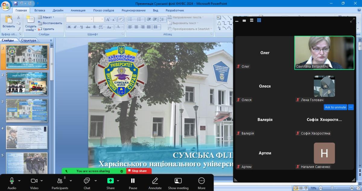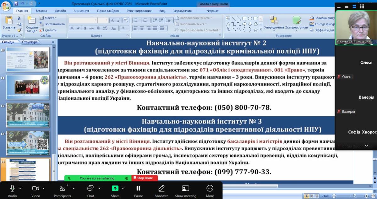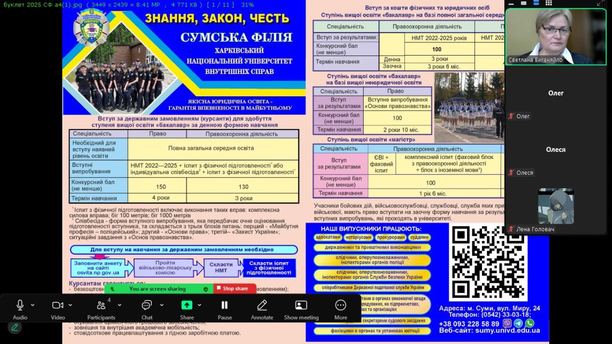 Завідувачка кафедри соціально-економічних дисциплін Сумської філії Харківського національного університету внутрішніх справ Світлана Виганяйло провела профорієнтаційну бесіду з учнями 11 класів Ліцею №1 м. Путивль. Мета заходу – ознайомлення майбутніх абітурієнтів з навчальним закладом, напрямками та спеціальностями, пов’язаними з діяльністю Національної поліції, а також умовами вступу до університету.
