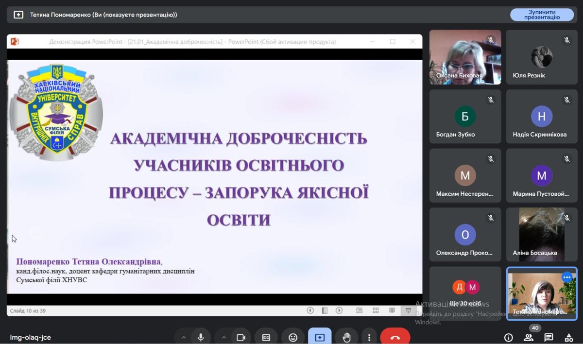 21 січня 2025 року організований і проведений інформаційно-просвітницький захід «Академічна доброчесність учасників освітнього процесу – запорука якісної освіти» для здобувачів професійно-технічної освіти та педагогічних працівників ДНЗ «Білопільське вище професійне училище» доцентом кафедри гуманітарних дисциплін Сумської філії ХНУВС Тетяною Пономаренко.