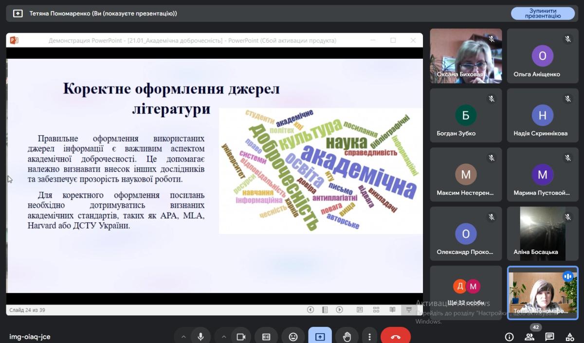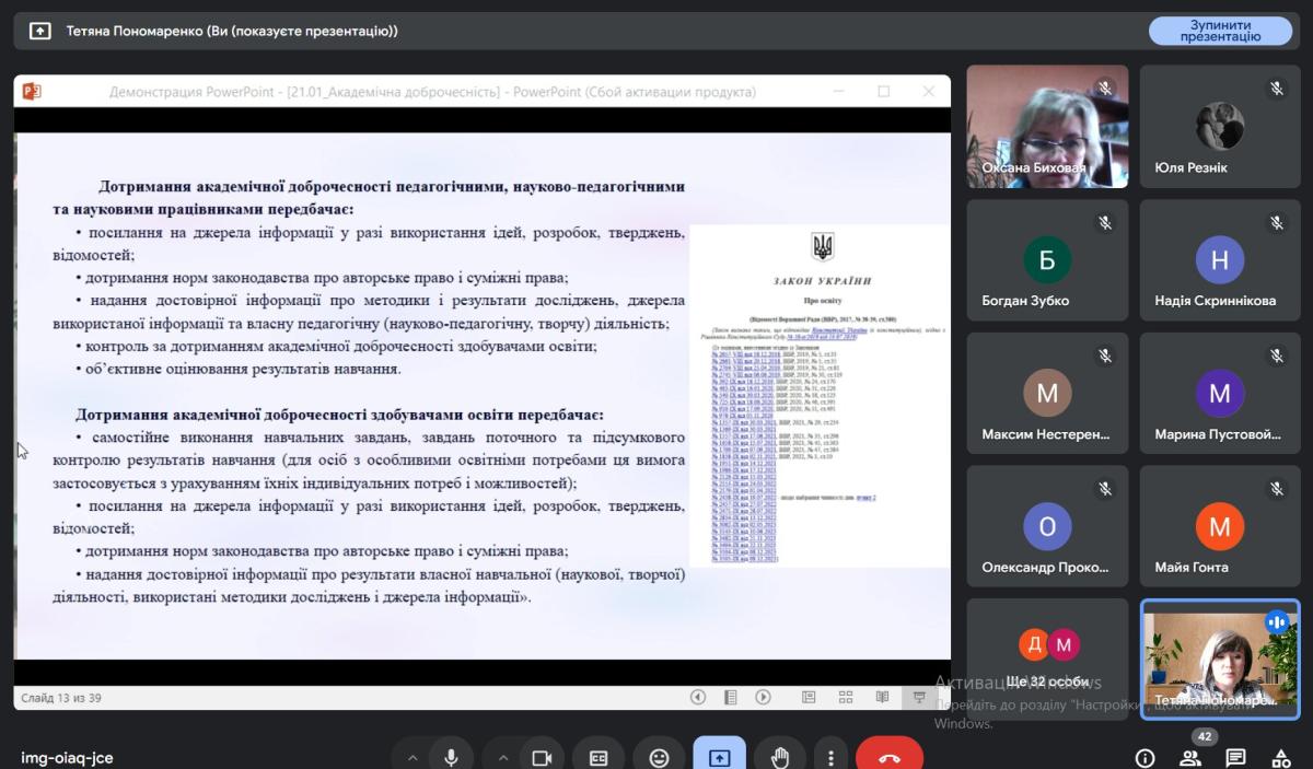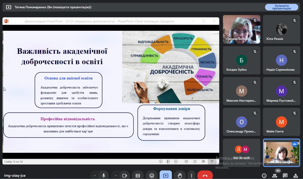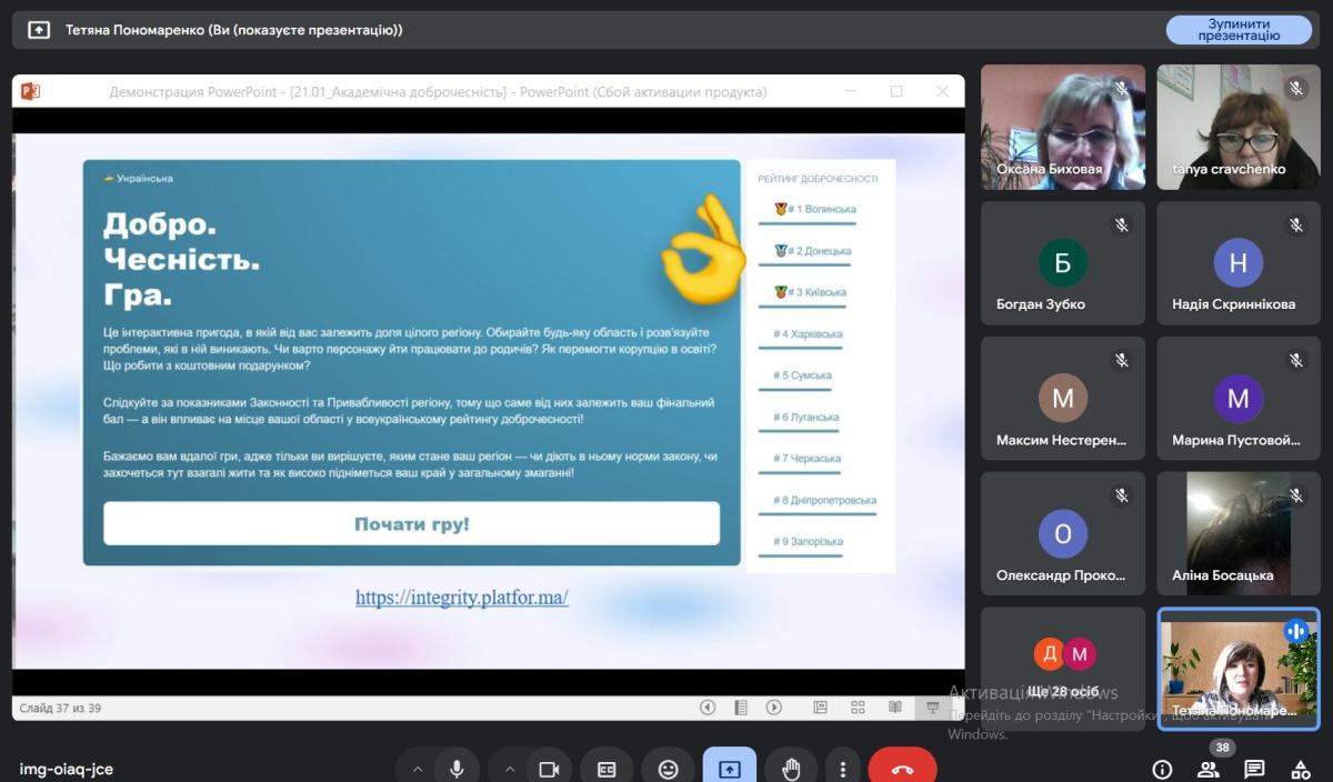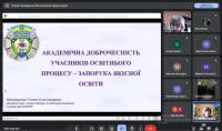 Тетяна Пономаренко акцентувала увагу на формуванні нульової толерантності до корупції та хабарництва як проявів недоброчесності, а також важливості дотримання принципів академічної доброчесності усіма учасниками освітнього процесу на шляху до євроінтеграції. Здобувачам освіти та педагогічним працівникам було запропоновано взяти участь в інтерактивній онлайн-грі «Добро.Чесність.Гра» від НАЗК.