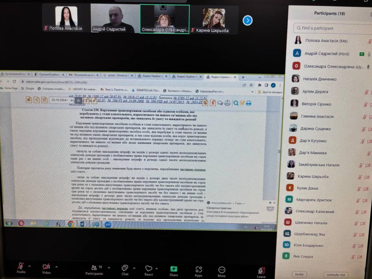 У рамках заняття було розглянуто основні етапи адміністративно-деліктного провадження, особливості роботи правоохоронних органів у цій сфері та роль суду у вирішенні адміністративних справ. Суддя Олександра ШУЛІКА поділилася практичними прикладами зі своєї професійної діяльності, пояснила процедуру розгляду адміністративних справ у суді на прикладі статті 173 Кодексу України про адміністративні правопорушення та акцентувала увагу на поширених помилках, які виникають при складанні адміністративних матеріалів.