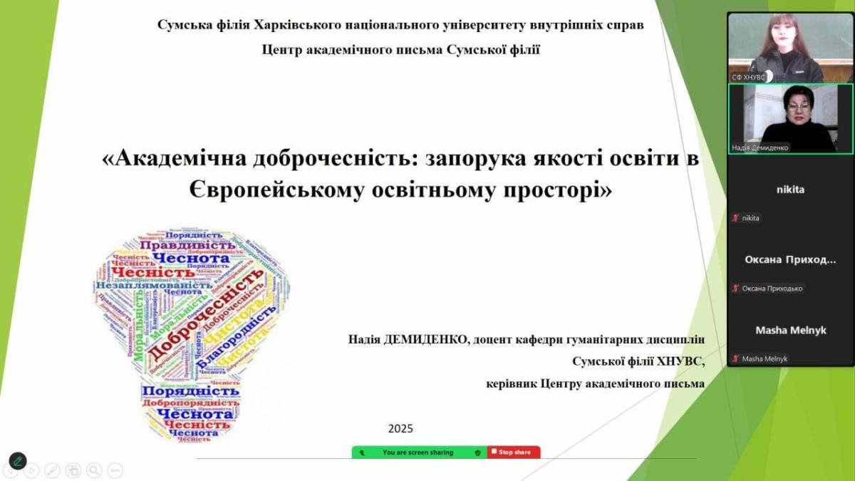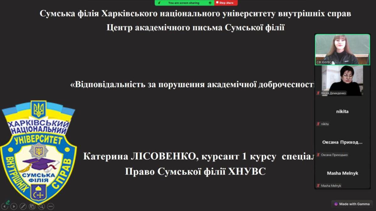 Для здобувачів загальної середньої освіти КУ Сумська спеціалізована школа № 9 були проведені просвітницько-профорієнтаційні заходи – інтерактивне заняття «Академічна доброчесність як запорука якості освіти у Європейському освітньому просторі» та просвітницький івент на тему «Відповідальність за порушення академічної доброчесності» за організації доцента кафедри гуманітарних дисциплін Сумської філії ХНУВС Надії Демиденко та здобувача вищої освіти спеціальності 081 Право (поліцейські) Катерини Лісовенко.