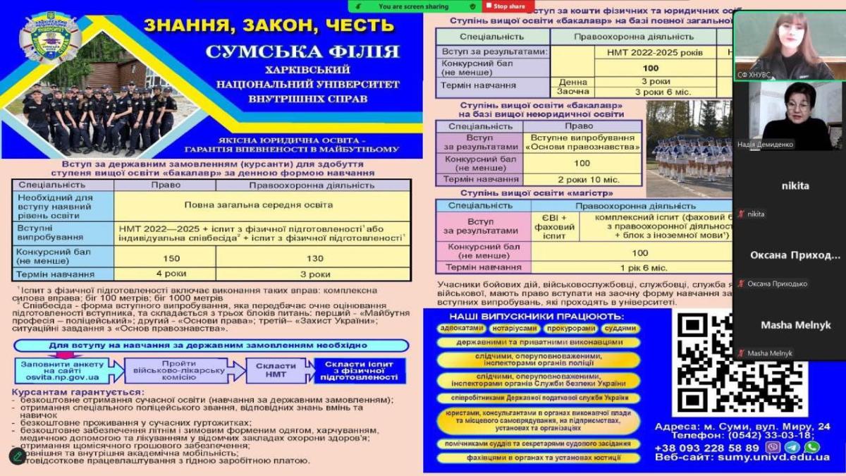 З особливим інтересом учні сприймали інформацію Катерини Лісовенко, яка зацікавила присутніх розповіддю про змістовне життя курсантів Сумської філії ХНУВС, які є активними учасниками різноманітних просвітницьких заходів, громадського життя, волонтерської діяльності тощо.