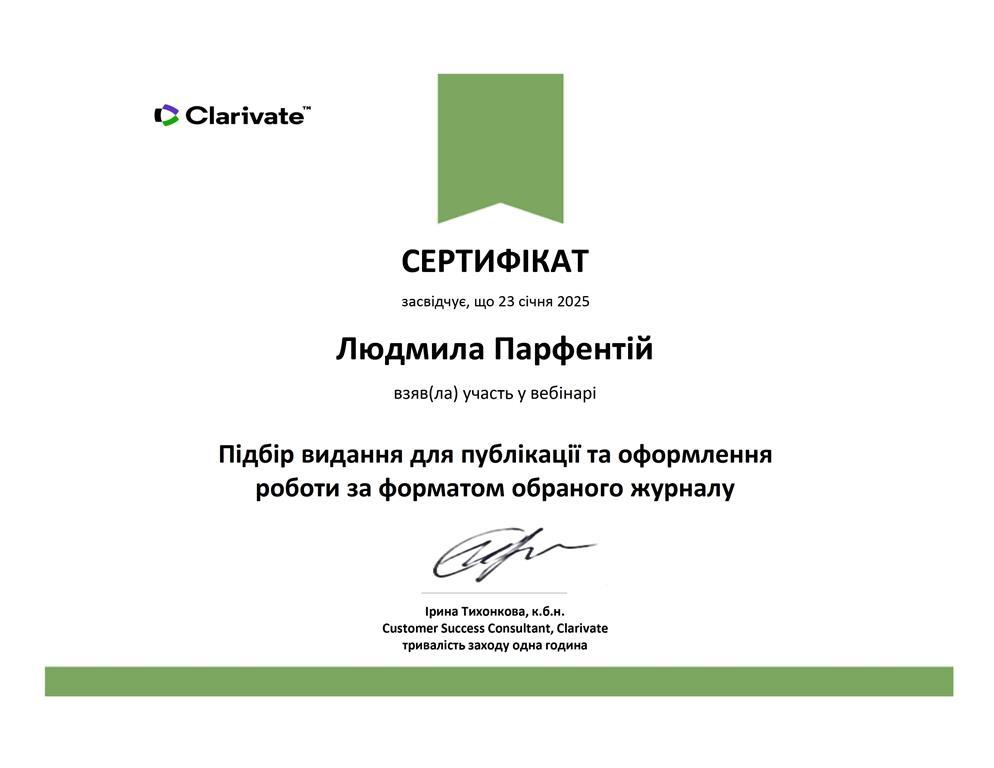 У січні 2025 року відбулися вебінари за темами «Підбір видання для публікації та оформлення роботи за форматом обраного журналу» та «Можливості використання даних, які містяться у Web of Science Core Collection щодо суспільних, гуманітарних наук і мистецтва», в яких взяла участь доцентка кафедри соціально-економічних дисциплін Сумської філії Харківського національного університету внутрішніх справ Людмила Парфентій.