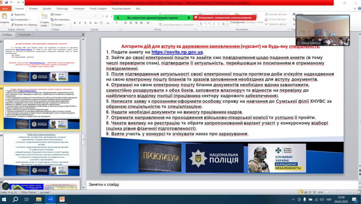 Також учні отримали актуальну детальну інформацію щодо можливого навчання на державному замовленні (курсанти) за спеціальністю Право і Правоохоронна діяльність, а також щодо особливостей та переваг такого навчання, до яких належать: гарантоване університетом 100% працевлаштування у системі правоохоронних органів з гідною зарплатнею та зі стабільним соціальними пакетом; початок трудового стажу з першого курсу навчання; отримання спеціального звання лейтенанта по закінченню навчання у Сумській філії Харківського національного університету внутрішніх справ; повне державне забезпечення та утримання протягом навчання (безкоштовне проживання у гуртожитку, харчування, форма, стипендія).