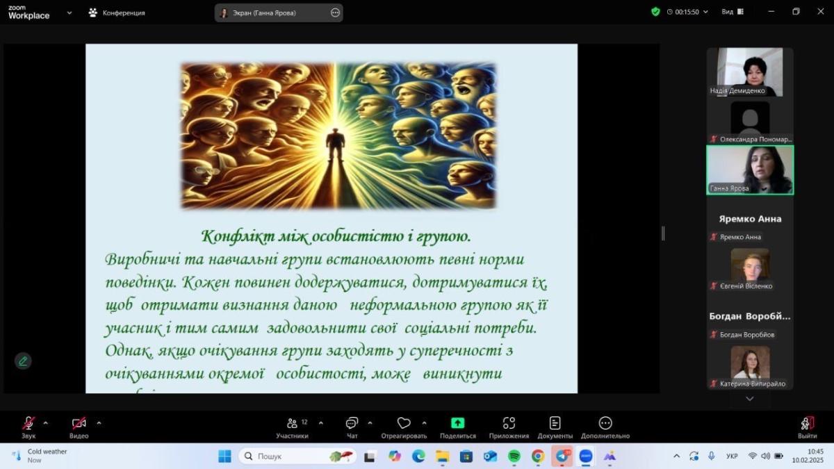 На бінарному занятті з дисципліни «Конфліктологія» для студентів 1 курсу спеціальності Право, організованому доцентом кафедри гуманітарних дисциплін Надією Демиденко за участі практичного психолога Сумської філії ХНУВС Ганни Ярової, обговорювались питання воєнних конфліктів і формування стресостійкості під час війни та повоєнної реабілітації.
