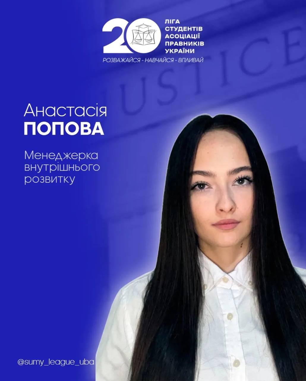 Студентку другого курсу Сумської філії Харківського національного університету внутрішніх справ Анастасію Попову обрано Мененджеркою внутрішнього розвитку Сумського осередку Ліги студентів Асоціації правників України.