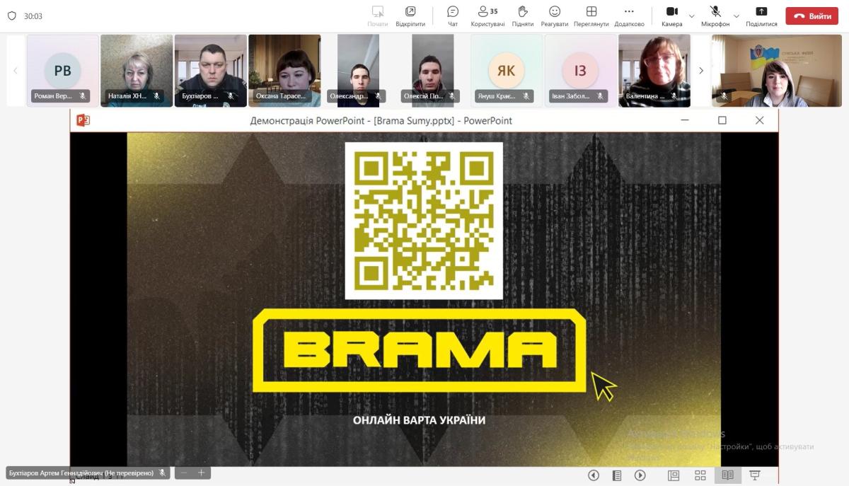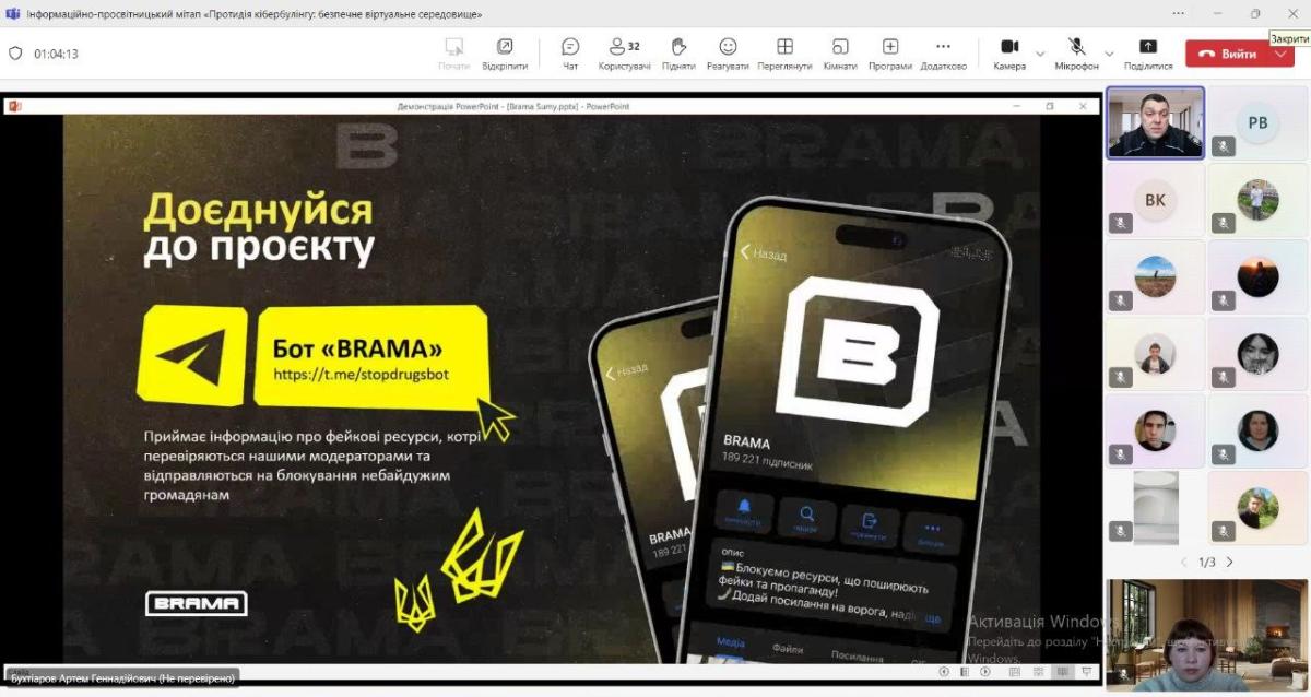 Артем Бухтіаров зосередив увагу учасників заходу на важливості адміністративної та кримінальної відповідальності в інтернет-просторі, закликав дотримуватися конфіденційності, уникати конфліктів і піклуватися про емоційну рівновагу, надав практичні поради як не стати жертвою кібербулінгу. Принагідно спікером було презентовано проєкт «Брама».