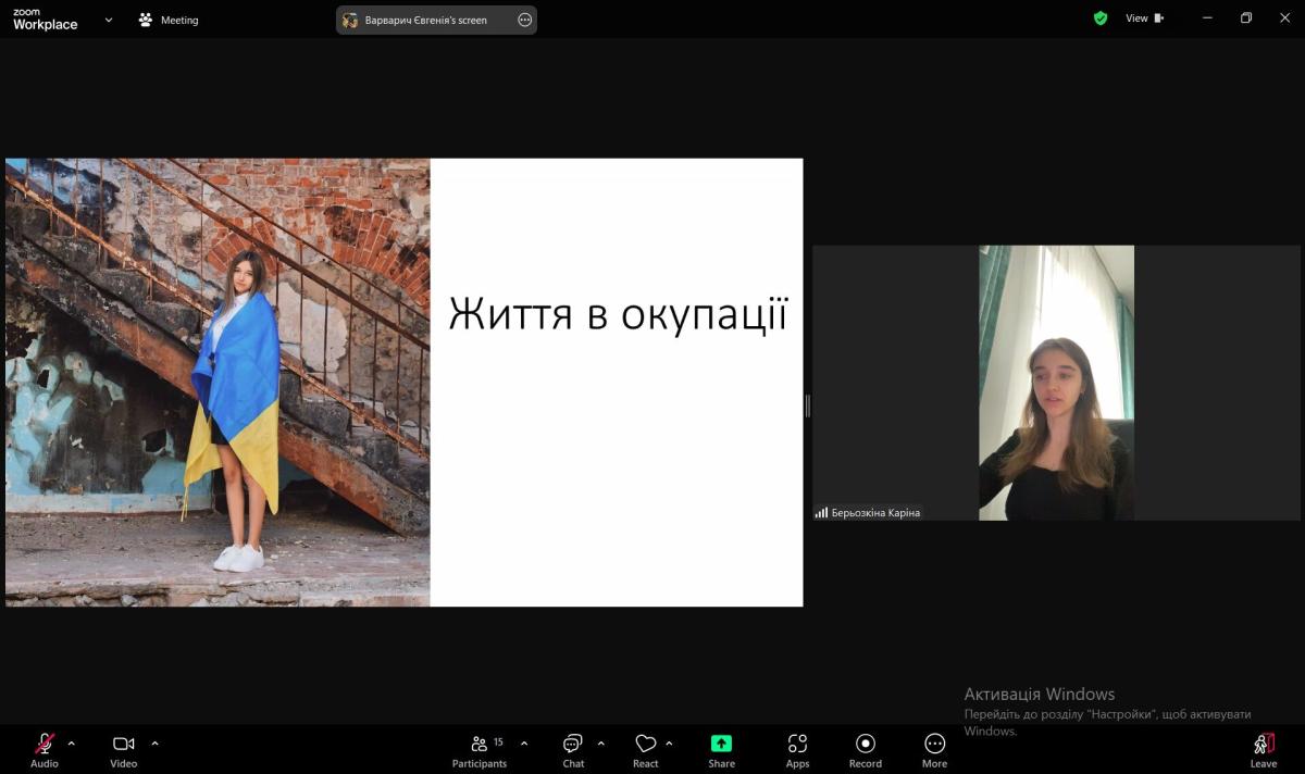 Здобувач вищої освіти 2 курсу спеціальності 081 Право Каріна Берьозкіна поділилась досвідом перебування під окупацією в м. Тростянець, зазначивши, що її рідне місто було звільнене 26 березня 2024 року 93-ю військовою бригадою Холодний Яр, яка іменування своє запозичила з назви Холодноярської республіки, бійці якої на території Черкащини у 1918-1921 рр. героїчно боролись за українську державність проти більшовицького терору.