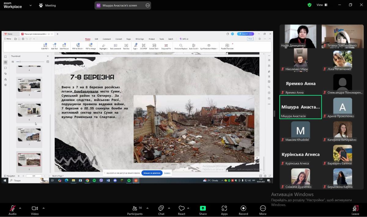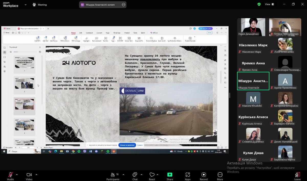 Здобувач вищої освіти 1 курсу спеціальності 081 Право Анастасія Мішура, презентуючи спогади очевидців про початок повномасштабного вторгнення, зазначила, що мужня боротьба Сумської територіальної оборони значно уповільнила рух ворожих колон і допомогла вистояти іншим містам. Пізніше у знищених російських танках будуть знайдені карти Сумської області, якими користувались німці ще за часів Другої світової війни, а у танках – парадна форма та нагороди за взяття міст Суми, Харкова, Києва.