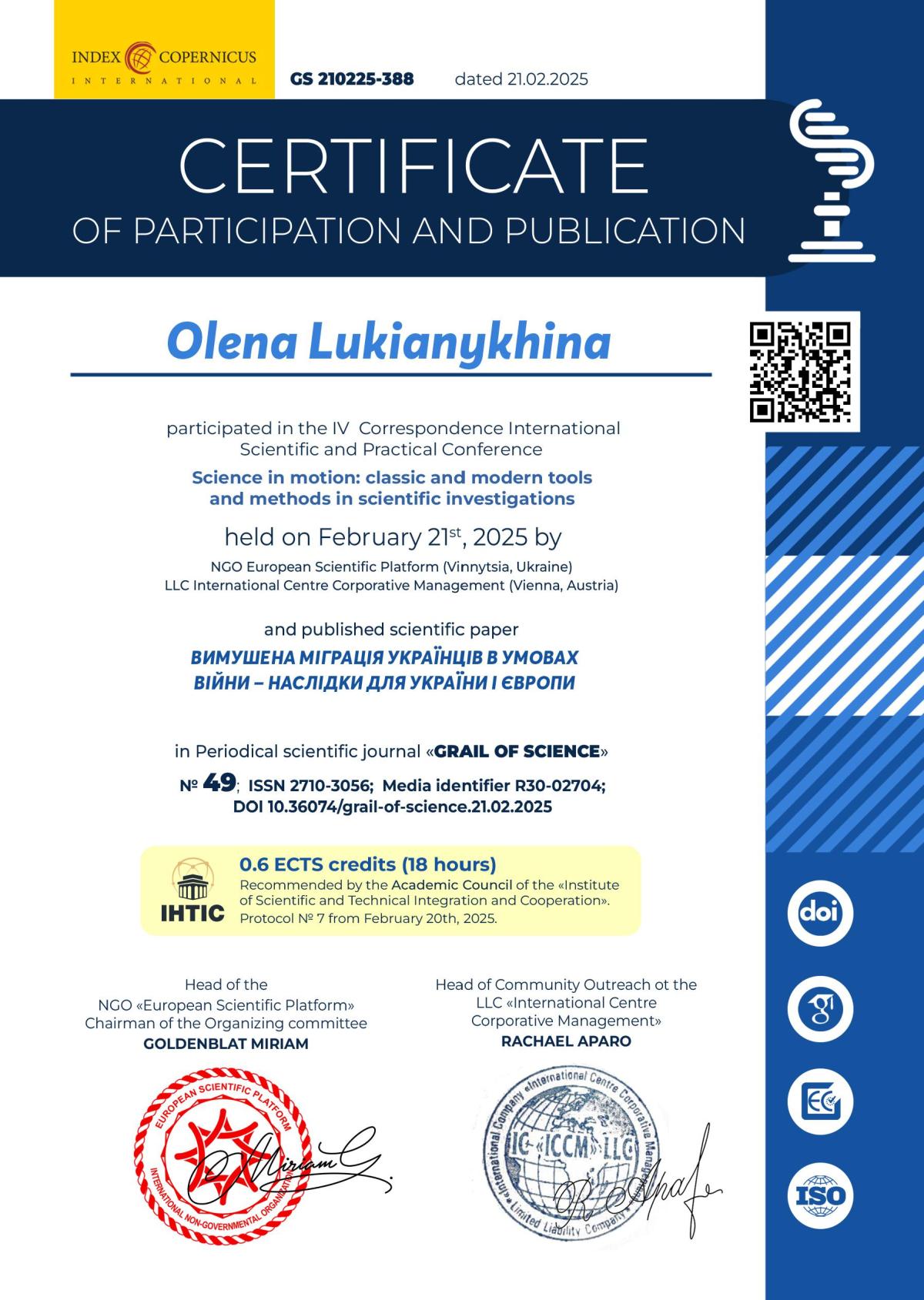 21 лютого 2025 року професор кафедри соціально-економічних дисциплін кандидат економічних наук, доцент Лук’янихіна Олена Анатоліївна разом із студенткою 2 курсу гр Сф дср23-1Пр Скибою Тетяною Геннадіївною взяли участь у IV Міжнародній науково-практичній конференції «SCIENCE IN MOTION: CLASSIC AND MODERN TOOLS AND METHODS IN SCIENTIFIC INVESTIGATIONS» (Vinnytsia, UKR - Vienna, AUT (Online).