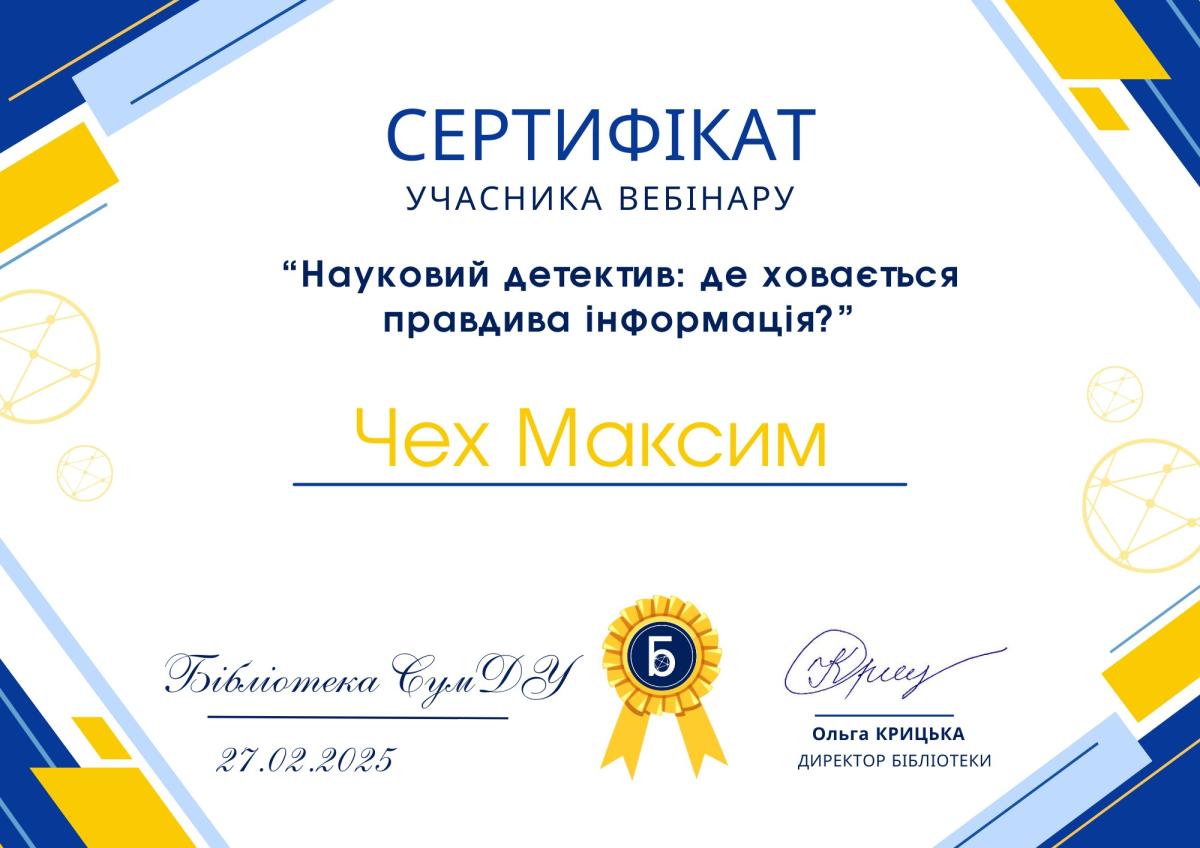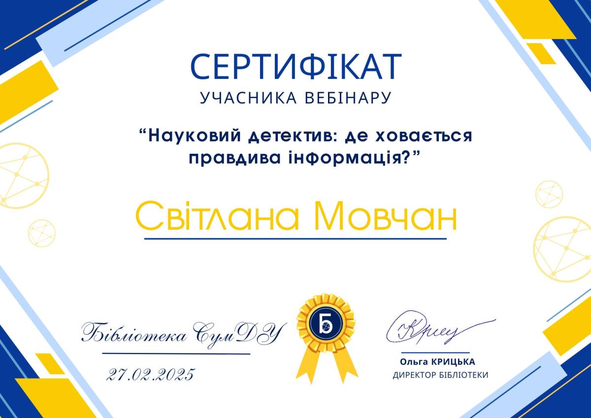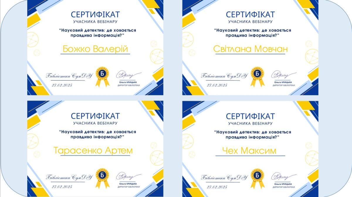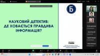 З метою практико-орієнтованої підготовки і в рамках вивчення дисципліни «Методологія наукової діяльності» здобувачі магістерського рівня вищої освіти спеціальності 081 Право Артем Тарасенко, Валерій Божко, Максим Чех і Світлана Мовчан, разом із професоркою кафедри соціально-економічних дисциплін Сумської філії ХНУВС кандидаткою економічних наук, доценткою Лук’янихіною Оленою Анатоліївною взяли участь у вебінарі «Науковий детектив: де ховається правдива інформація?».