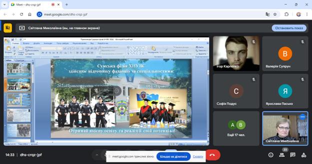 Завідувачка кафедри соціально-економічних дисциплін Сумської філії Харківського національного університету внутрішніх справ Світлана Виганяйло поспілкувалась із учнями комунальної установи Сумська спеціалізована школа І-ІІІ ступенів №1 ім.В.Стрельченка,. Мета профорієнтаційного заходу – ознайомлення майбутніх абітурієнтів та учнів старших класів із закладом вищої освіти - Сумською філією Харківського національного університету внутрішніх справ, спеціальностями, за якими здійснюється підготовка фахівців, а також умовами вступу до університету. Здобувачі познайомились з особливостями освітнього процесу, науковою діяльністю здобувачів, їх дозвіллям, матеріально-технічною базою закладу, та перспективами побудови кар’єри.