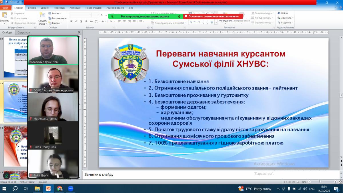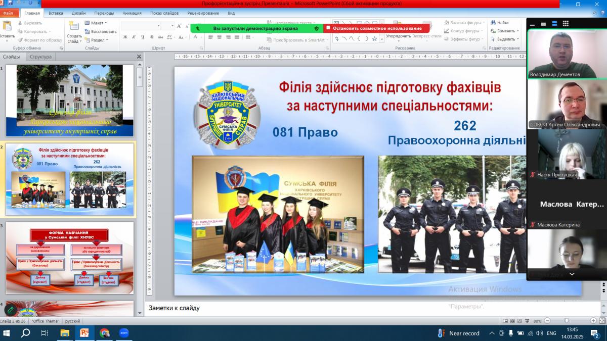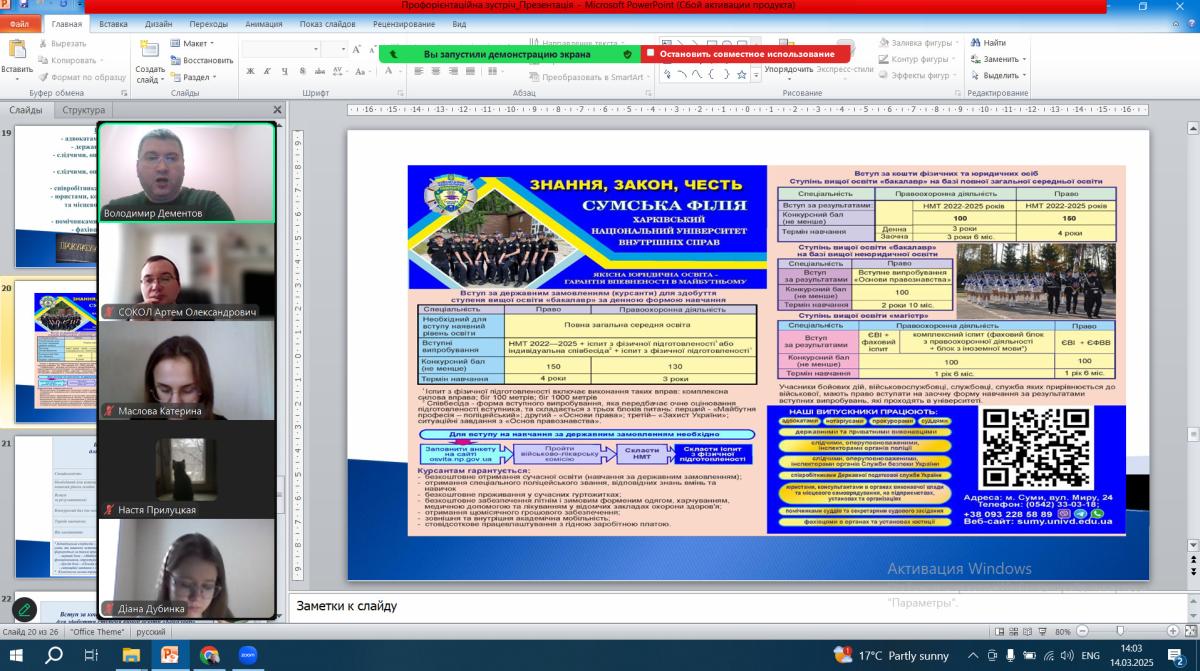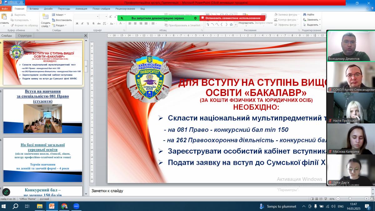 Під час зустрічі доповідач наголосив й на перевагах навчання у Сумській філії за кошт фізичних та юридичних осіб, до яких можна віднести, в тому числі, й якісну комплексну всебічну підготовку майбутніх юристів і правоохоронців як в правовій (спеціальній), так і в економічній та гуманітарній сферах, що значно розширює компетентності здобувачів та збільшує їх шанси на успішне працевлаштування та побудову успішної кар’єри в професії.