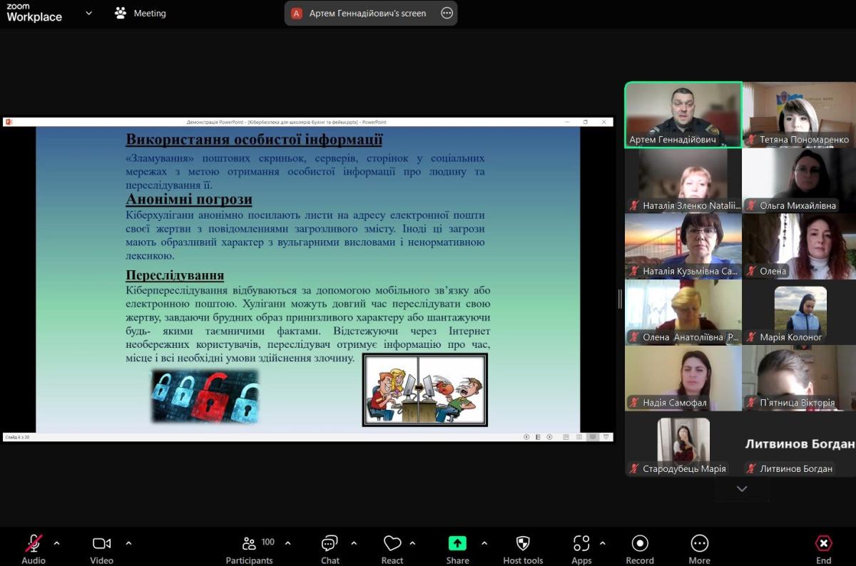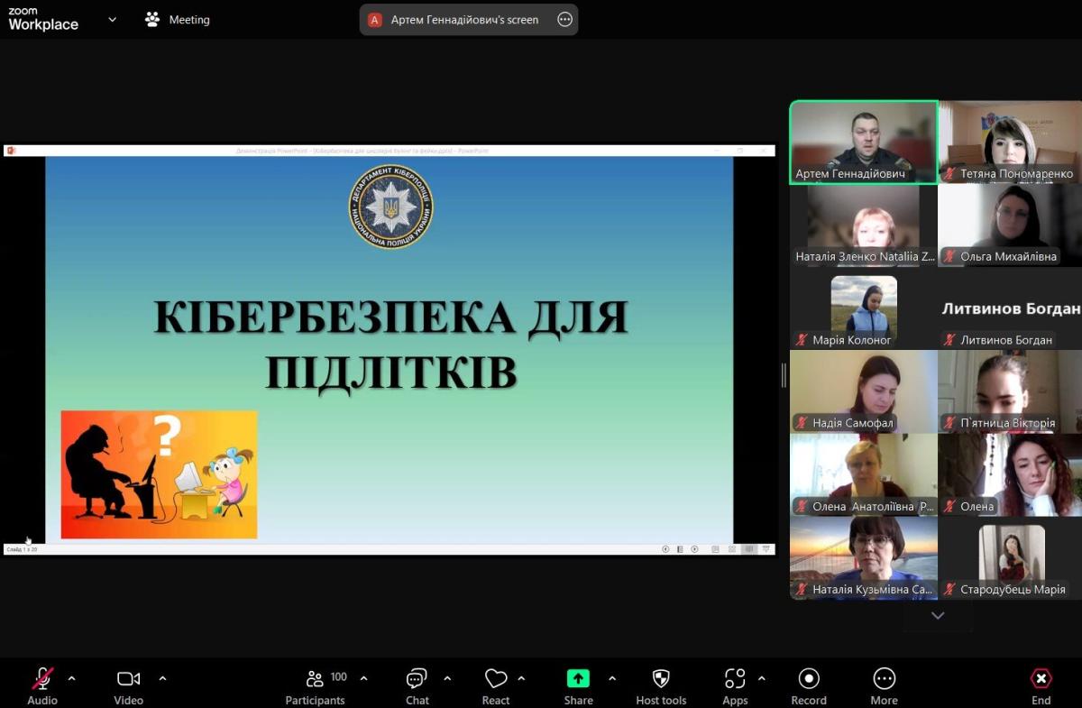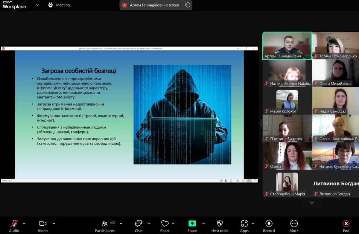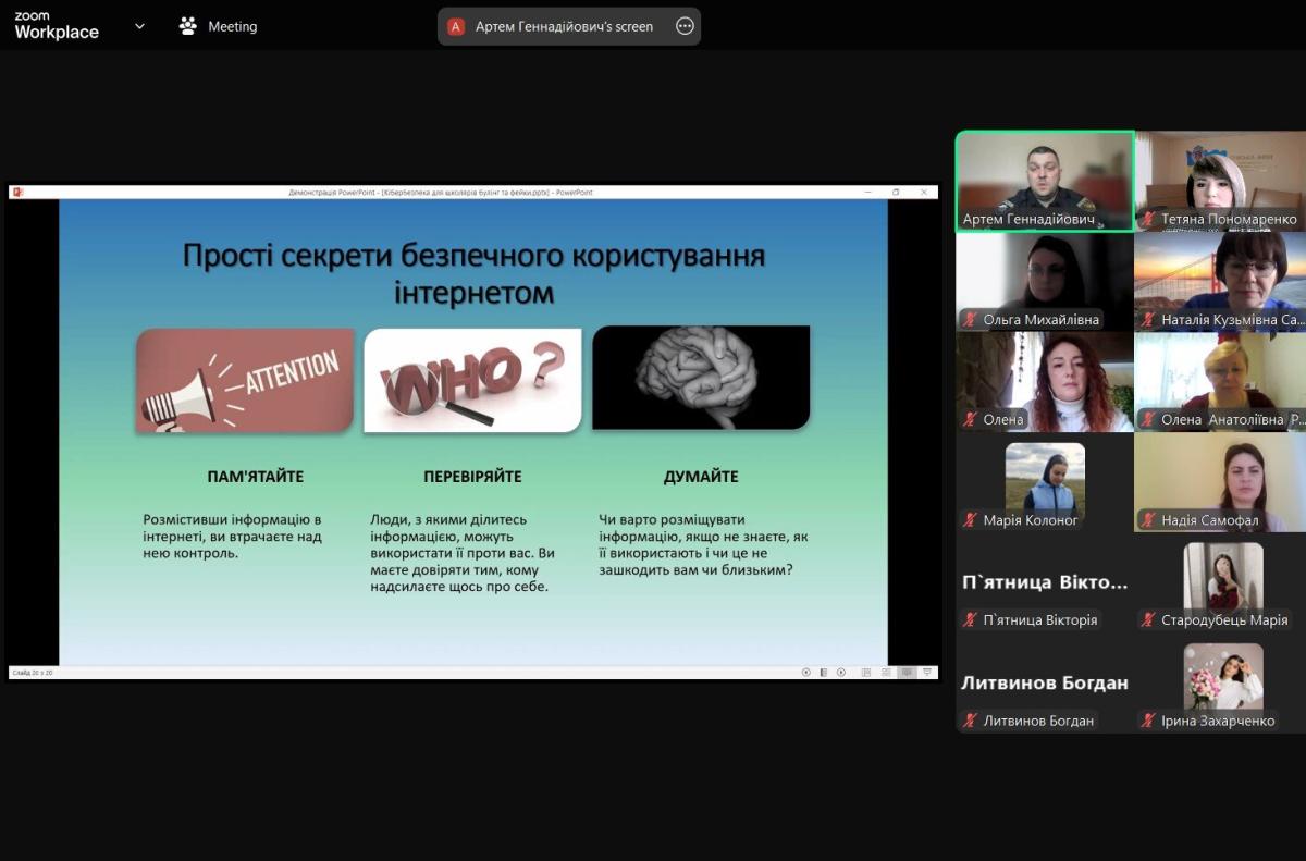 У межах профорієнтаційної роботи кафедри гуманітарних дисциплін Сумської філії ХНУВС зі здобувачами загальної середньої освіти Свеської спеціалізованої школи І-ІІІ ступенів №2 «ліцей», Середино-Будського ліцею №1 та Середино-Будського ліцею №2 Середино-Будської міської ради Сумської області проведено правоосвітній захід – інформаційно-просвітницький мітап «Кібербезпека для підлітків» за участі старшого інспектора із особливих доручень відділу протидії кіберзлочинам у Сумській області Департаменту кіберполіції Національної поліції України Артема Бухтіарова.