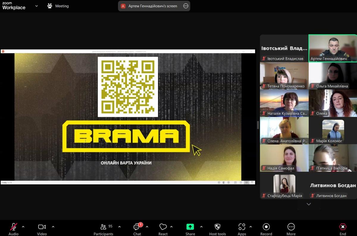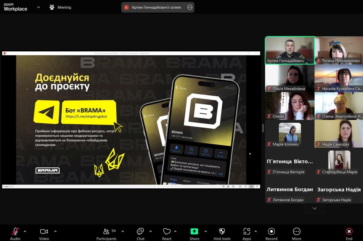Старший інспектор Артем Бухтіаров зосередив увагу учасників заходу на особливостях кіберзлочинів в умовах воєнного стану, наголосивши, що у Сумській області найбільш поширеним видом таких злочинів є фішинг, тобто через посилання шахраї намагаються отримати доступ до соціальних мереж, щоб заволодіти даними особи. Спікер акцентував увагу присутніх на адміністративній та кримінальній відповідальності за вчинені кіберзлочини, закликав дотримуватися конфіденційності, уникати конфліктів і піклуватися про емоційну рівновагу, надав практичні поради як не стати жертвою кібербулінгу та інших кібезлочинів. Принагідно спікером було презентовано проєкт «Брама», спрямований на покращення медіаграмотності серед українців та зменшення впливу пропаганди рф на суспільство