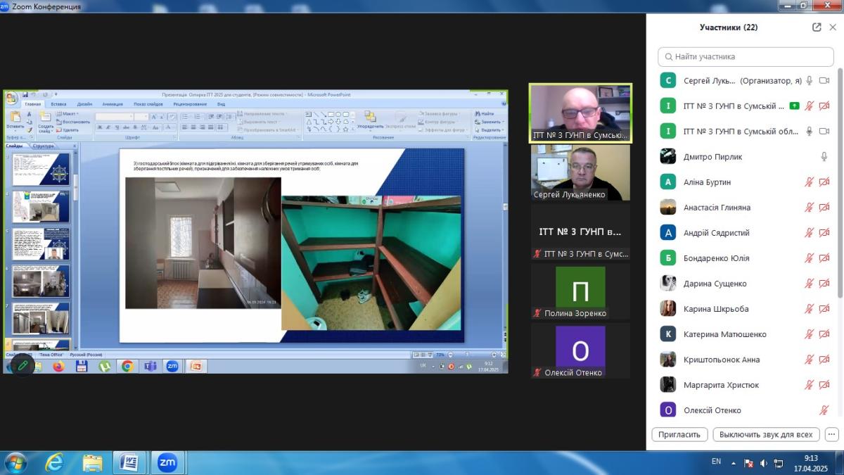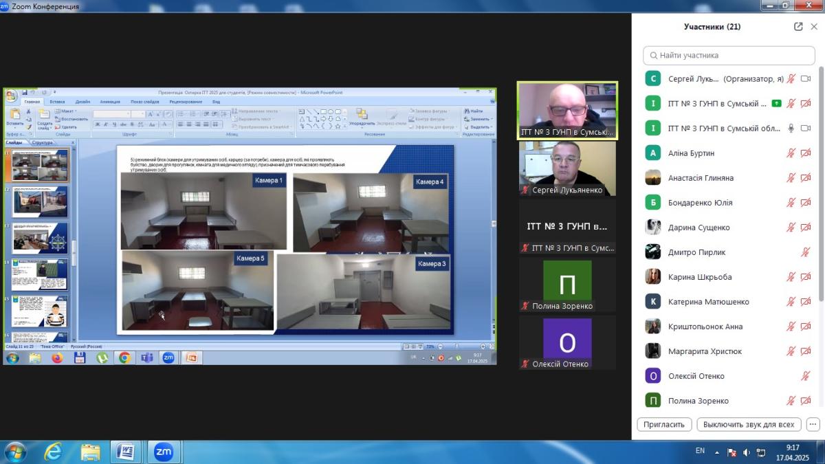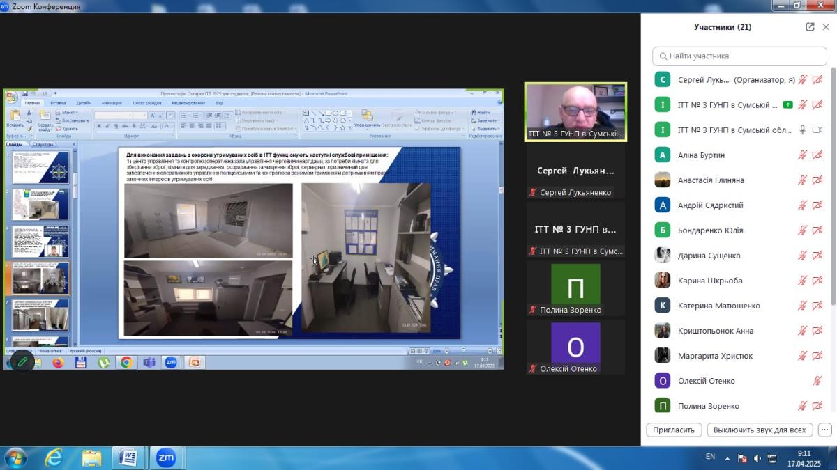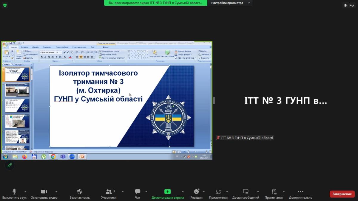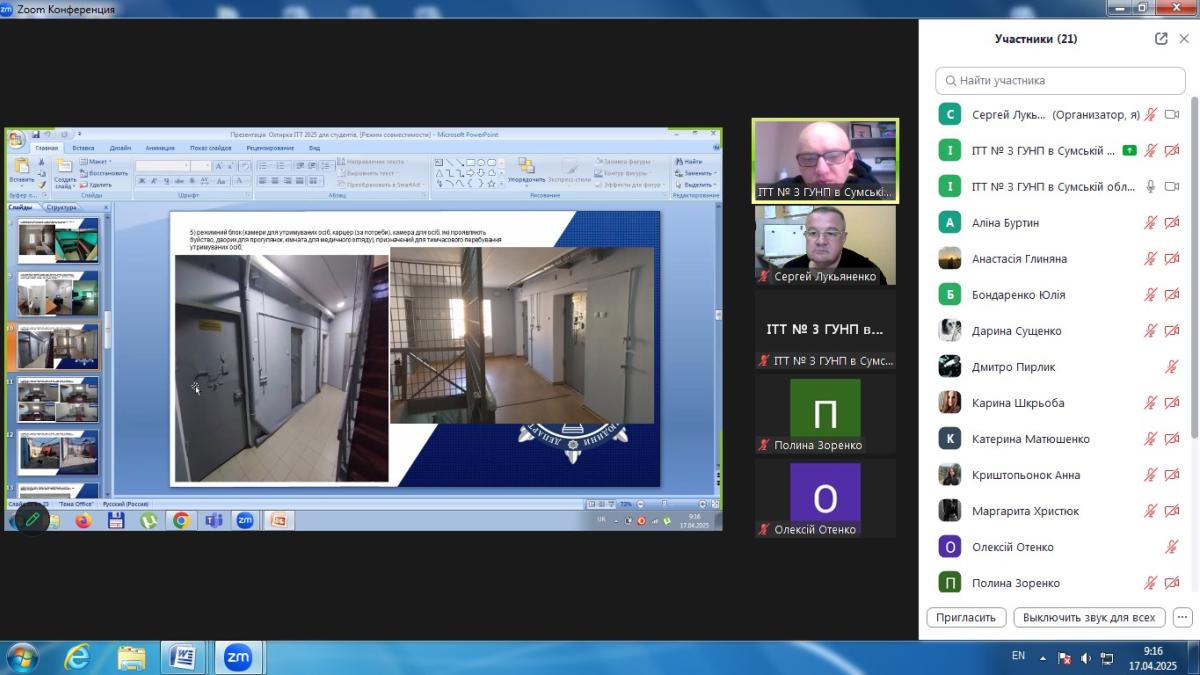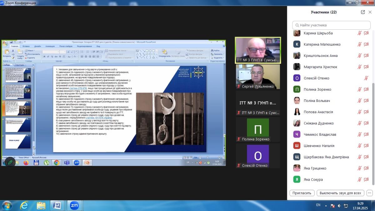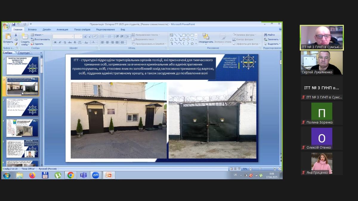 До заняття був запрошений начальник ІТТ № 3 м. Охтирка ГУНП в Сумській області майор поліції Педорченко Сергій Володимирович, який поділився зі студентами практичним досвідом та особливостями роботи ізолятора. У ході заняття було розглянуто правові основи функціонування ІТТ, порядок поміщення та утримання підозрюваних, обвинувачених і засуджених, їхні права та обов’язки, а також процедури звільнення осіб з ІТТ.